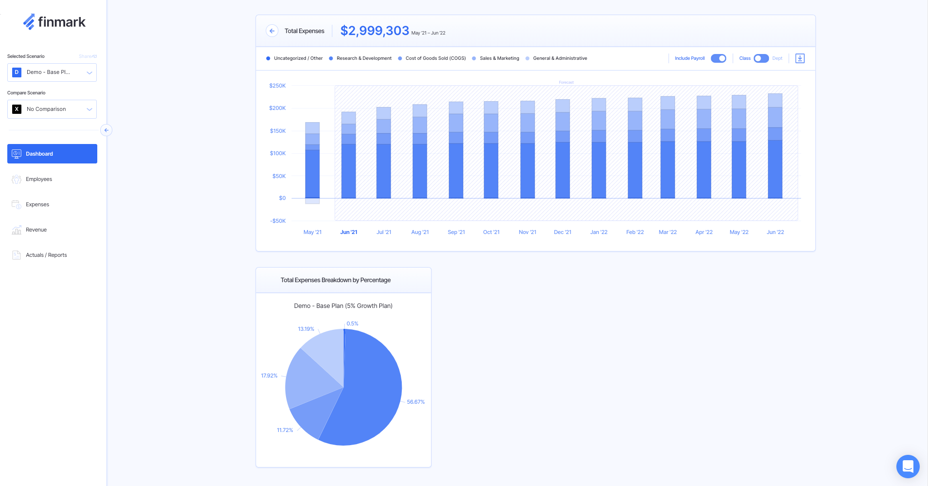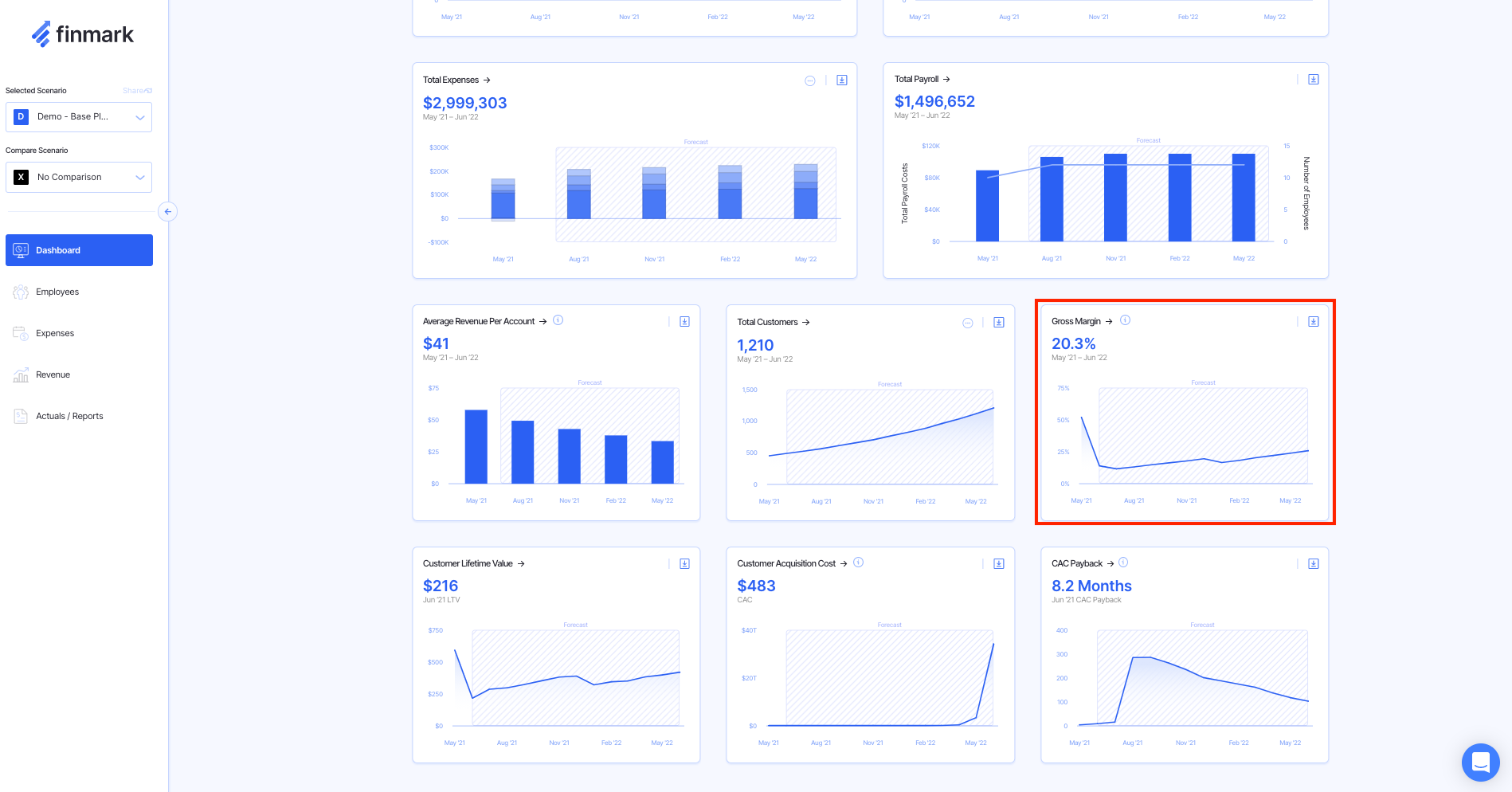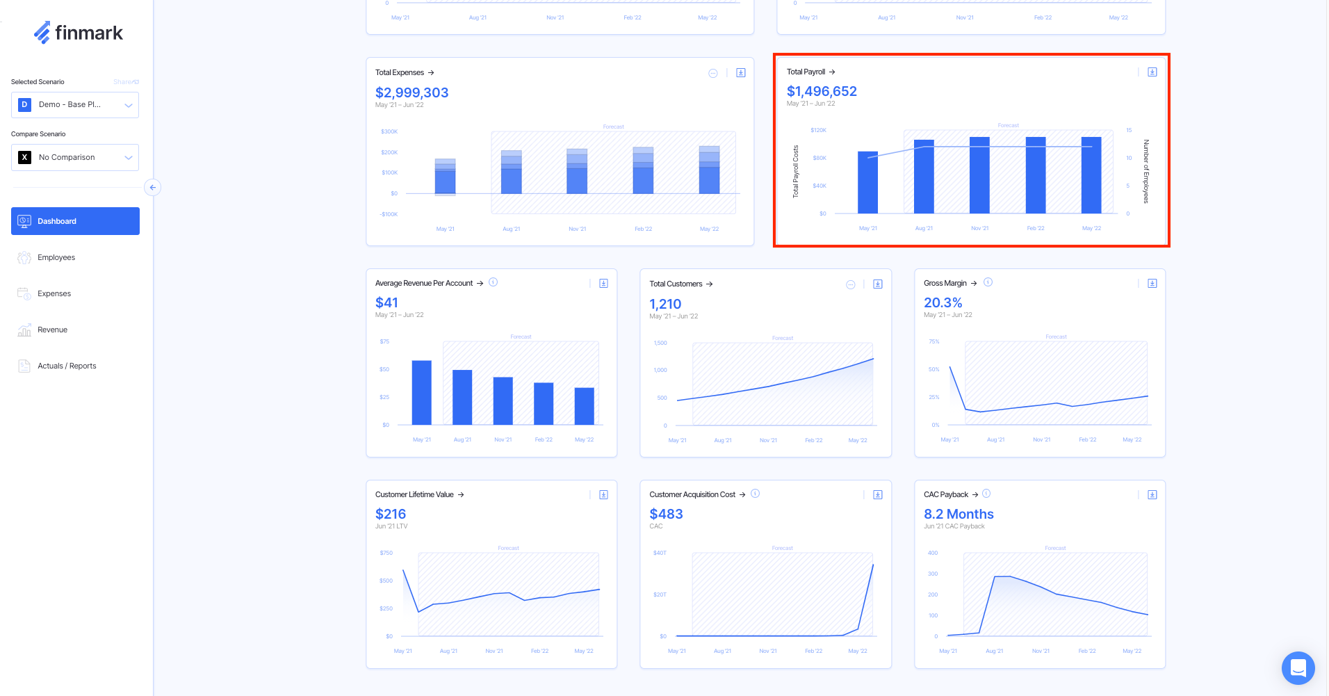The Dashboard lets you visualize your historical and forecasted key financial metrics, such as: