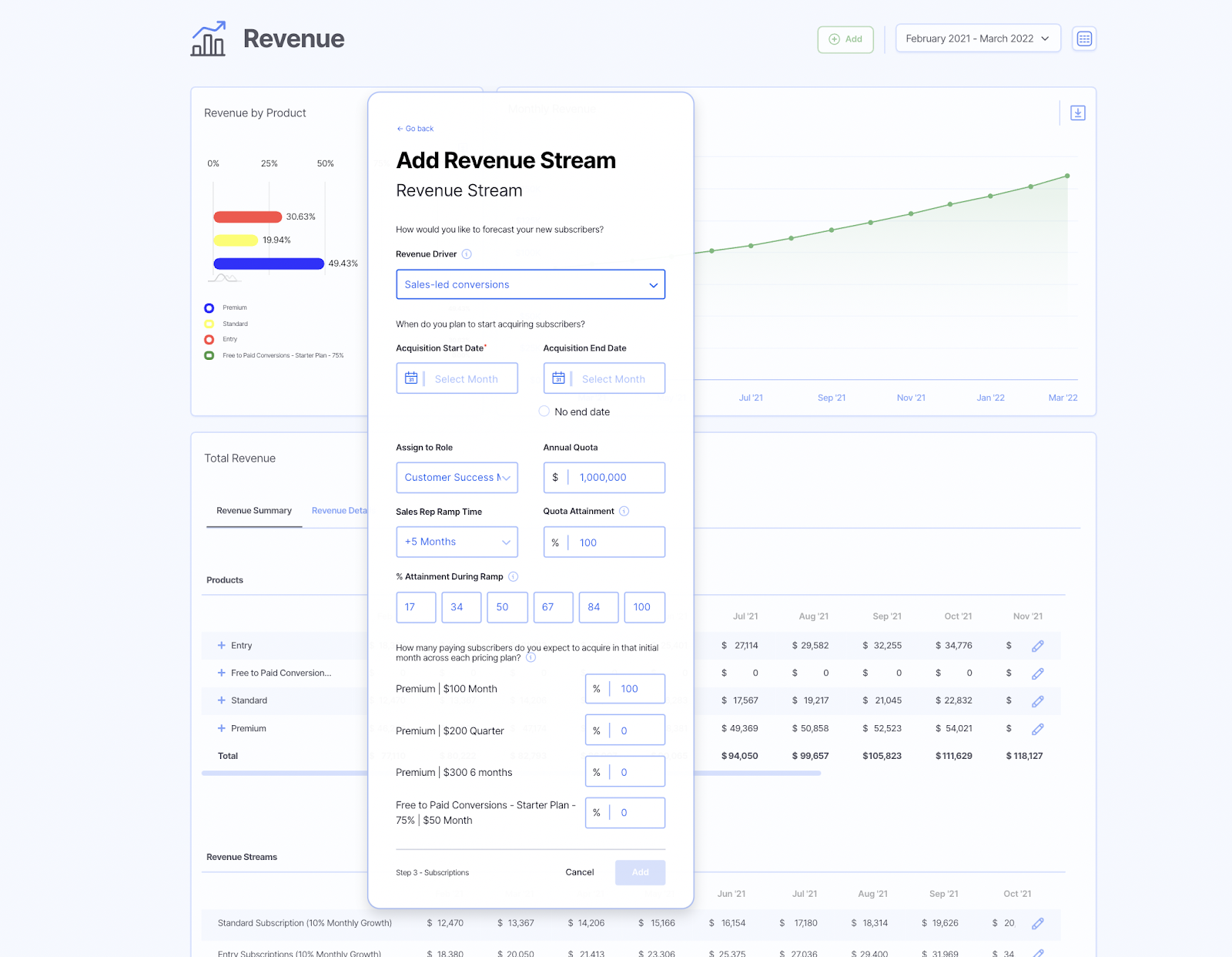 4: Select the product(s) associated with this revenue stream, and then select Sales-led Conversions from the Revenue Driver dropdown menu.