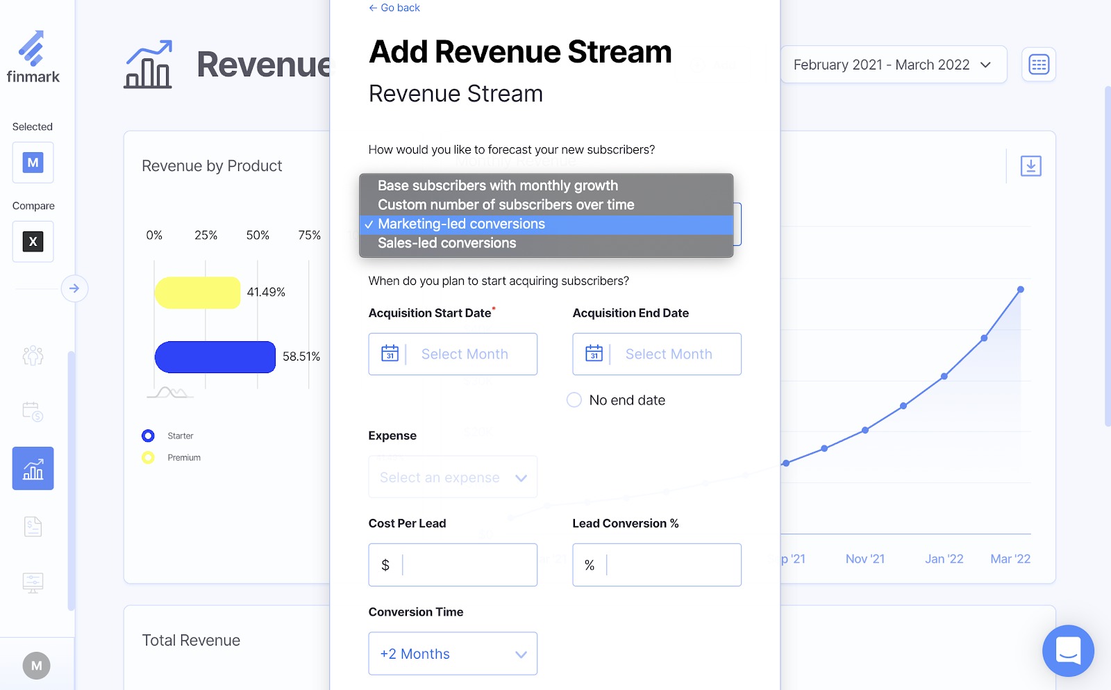 3: Select the product(s) associated with this revenue stream, and then select Marketing-led Conversions from the Revenue Driver dropdown menu.