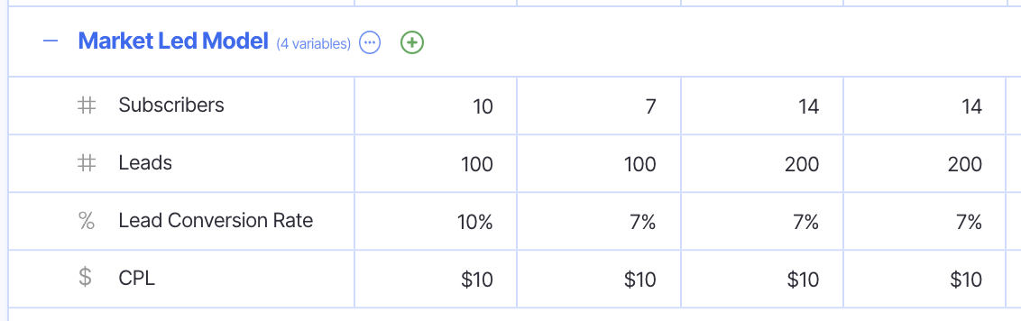 In the case that you would like to customize any portion of your marketing led forecast, such as conversion rate overtime or cost per lead we suggest utilizing the custom variable section as shown below.