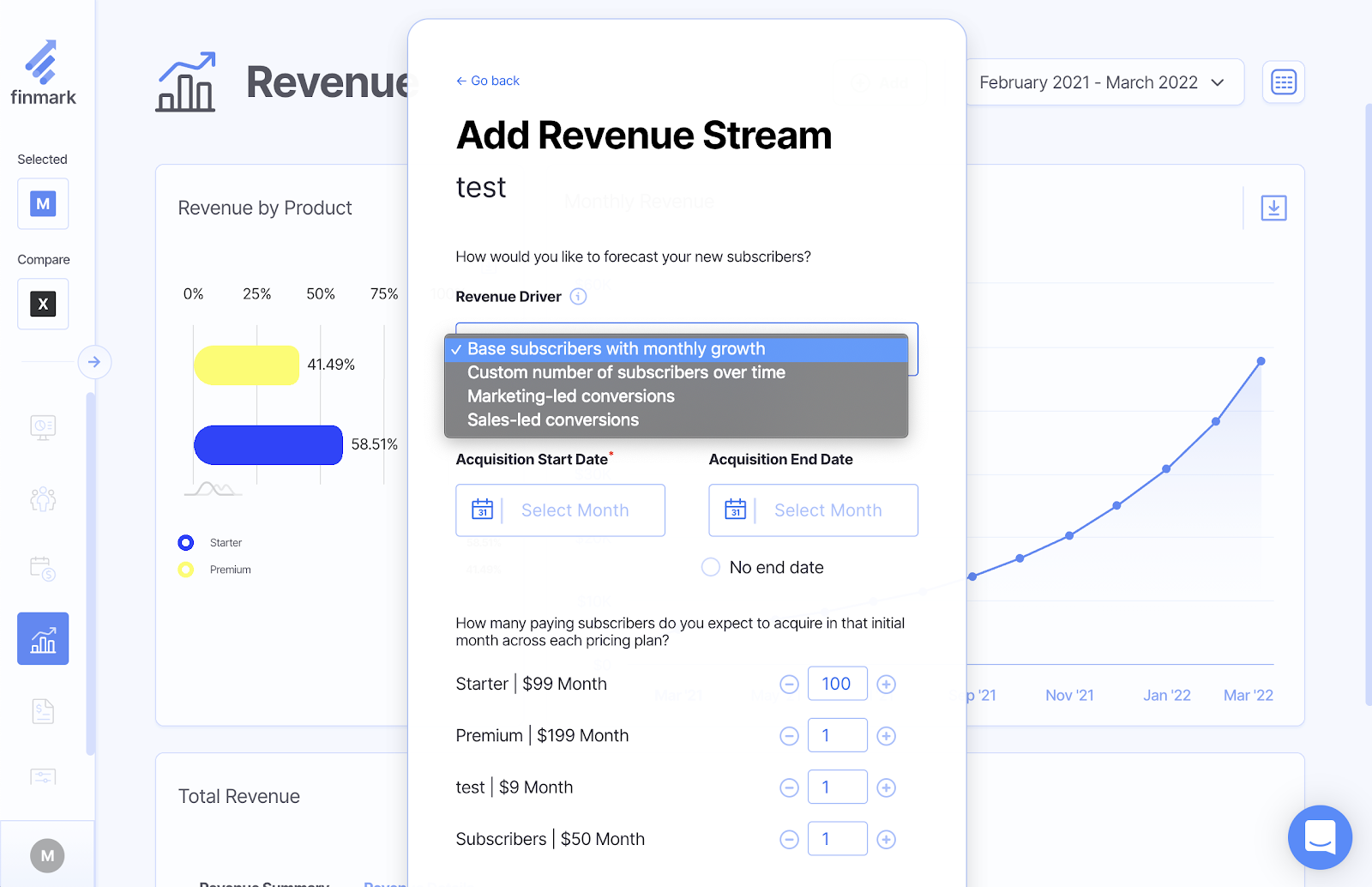 4: Select Base subscribers with monthly growth from the Revenue Driver dropdown menu.