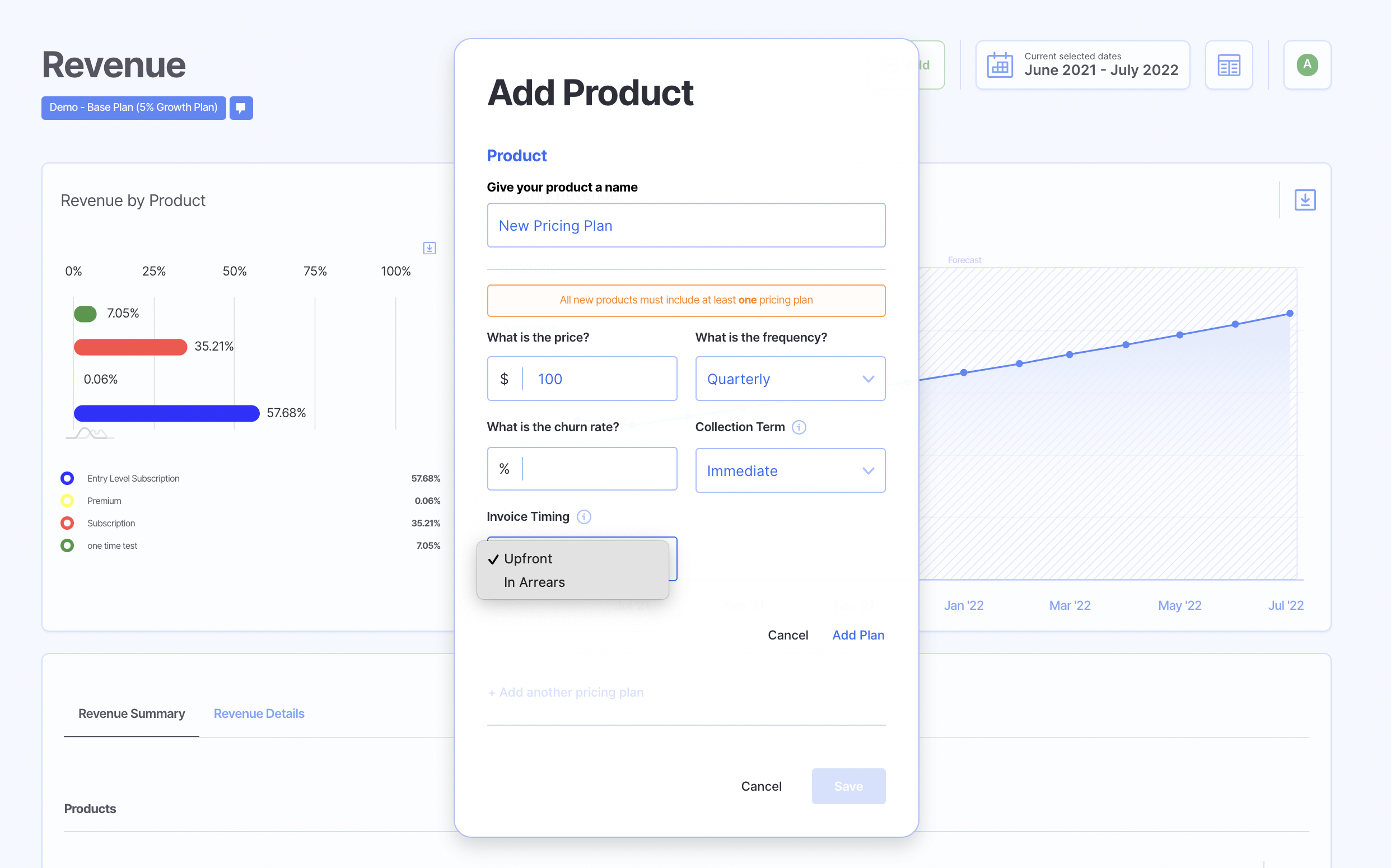 When the pricing plan has a frequency set to Quarterly, Semi-Annually, or Annually you can now set the invoice timing as either Upfront or in Arrears.