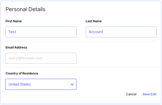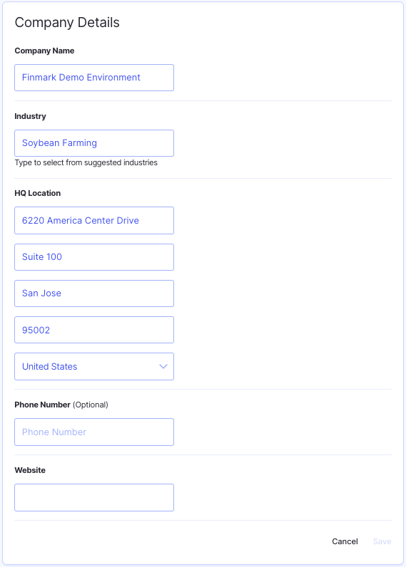 You can update the company details by clicking on the pencil in the top right hand corner. The following information is required to become a Finmark Customer:
