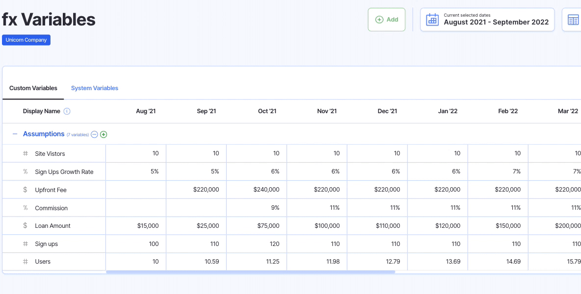 Unlike System Variablesーwhich are calculated by Finmark and are not editableーCustom Variables let you create metrics unique to your business model. Then, leverage these custom variables to tailor formulas and modeling for your revenue and expenses.