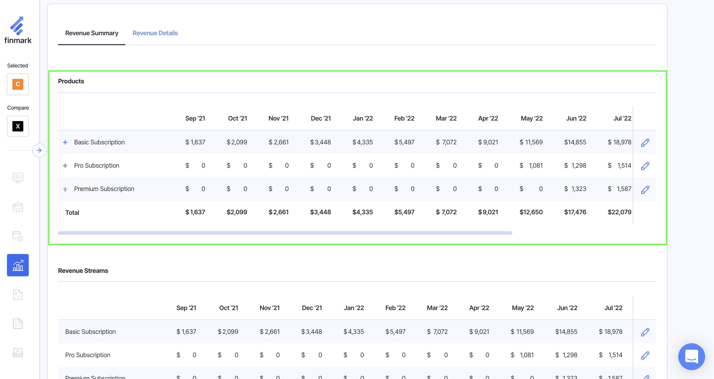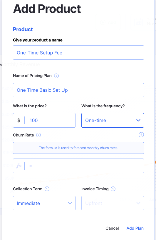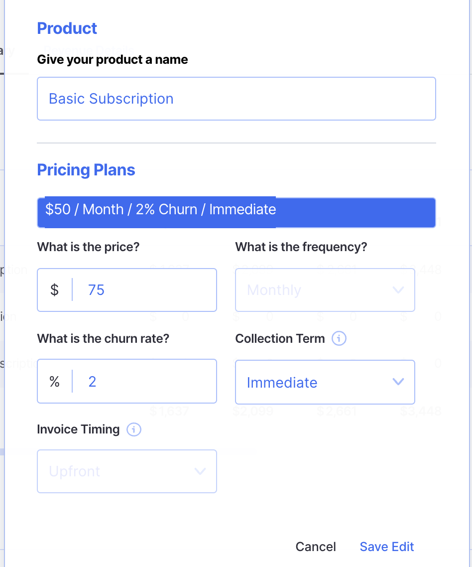In Finmark, you can add Products and Pricing to forecast Subscriptions or One-Time Purchases. If you have a subscription or a one-time purchase make sure to add your products and pricing plans prior to adding a revenue stream.
