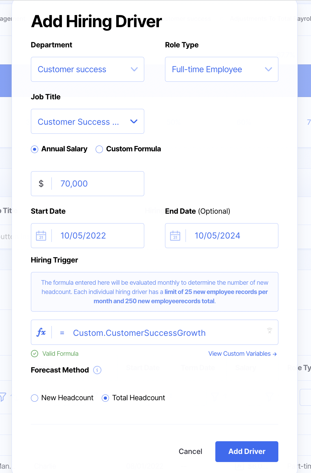 In Finmark, you can model your hiring growth over time using a custom formula. The hiring driver can forecast based on New Headcount or Total Headcount for a Given Role.