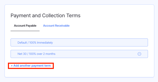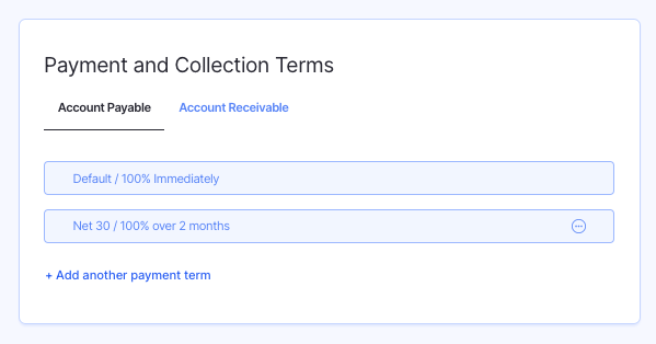 Please Note - The default setting is labeled as “Immediately” 1 Month set to 100%, This will apply to all current expenses. This payment term is uneditable.