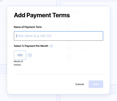 Add # of Months for Payment Term (Max 18 Months) by clicking the + Icon.