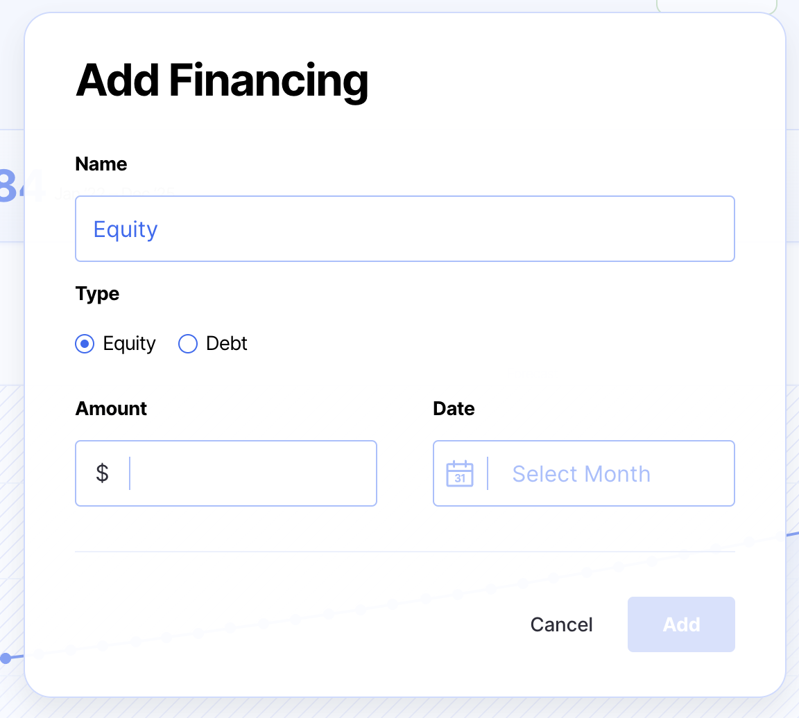 Import your equity or debt financing details to understand the impact your financing will have on your runway.