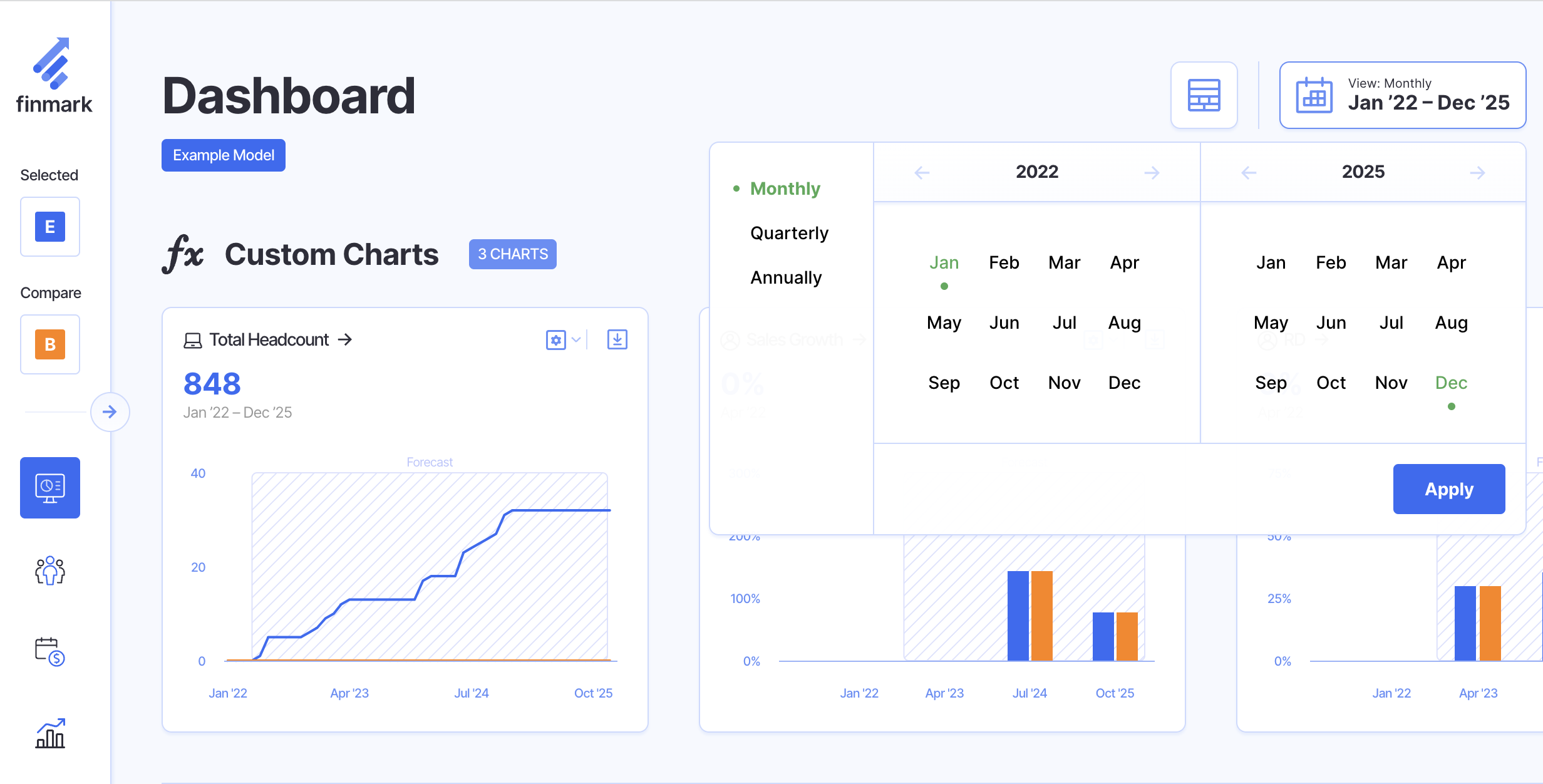 Set your dashboard view to Monthly, Quarterly, or Annual for an in-depth analysis of your KPIs by using the date picker: