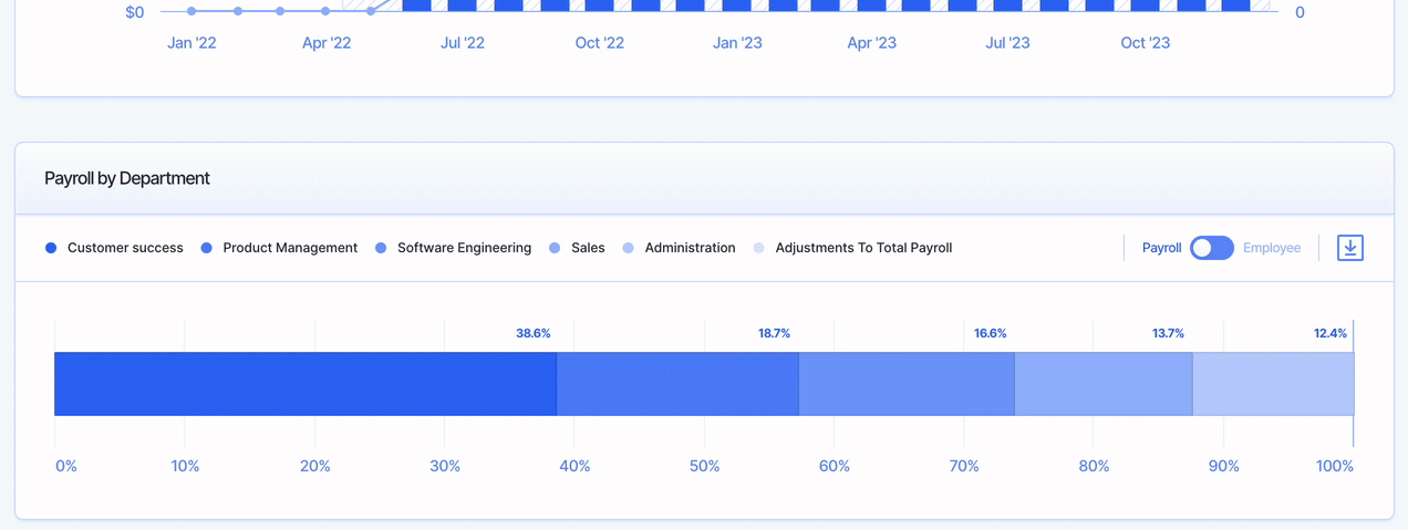 View a monthly breakdown of your total payroll and headcount to track your payroll budget each month.