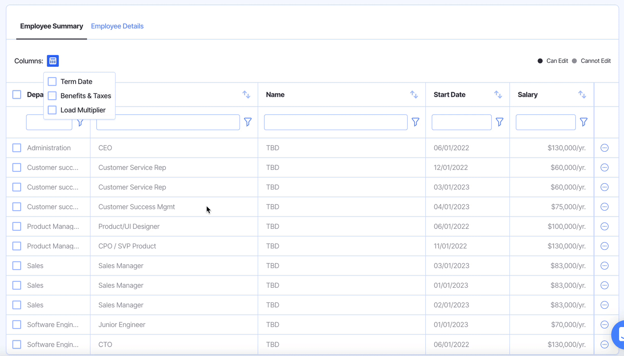 View a monthly breakdown of employees/contractors payroll and benefits. You can use this section to make adjustments for historical actuals and to edit future employee details.