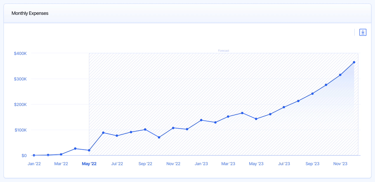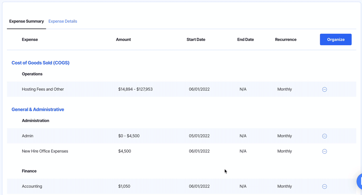 In the Expense Details section, you can view a monthly breakdown of your historical and future forecasted expenses. In this section, you can edit or adjust any historical or future expense budgets.