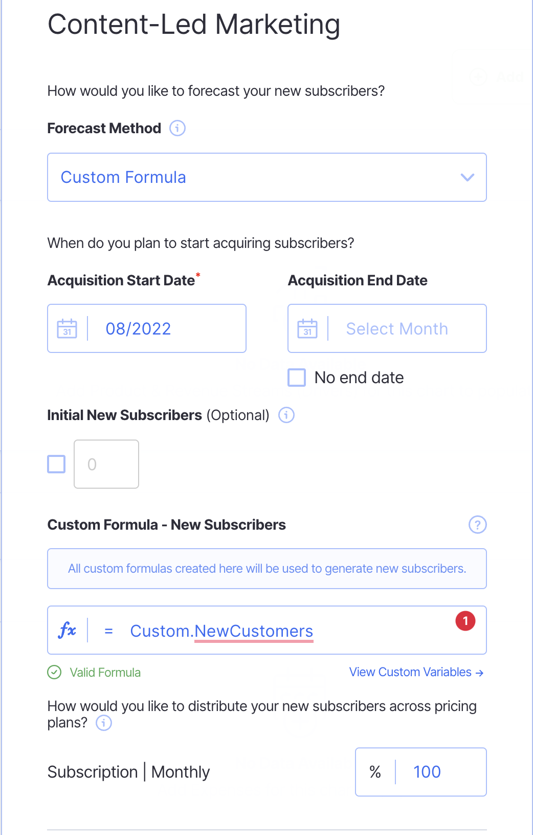 Step 3: Set the forecast method from the drop-down as Custom Formula. From here, fill in the remaining necessary details. For the custom formula you will enter the following: