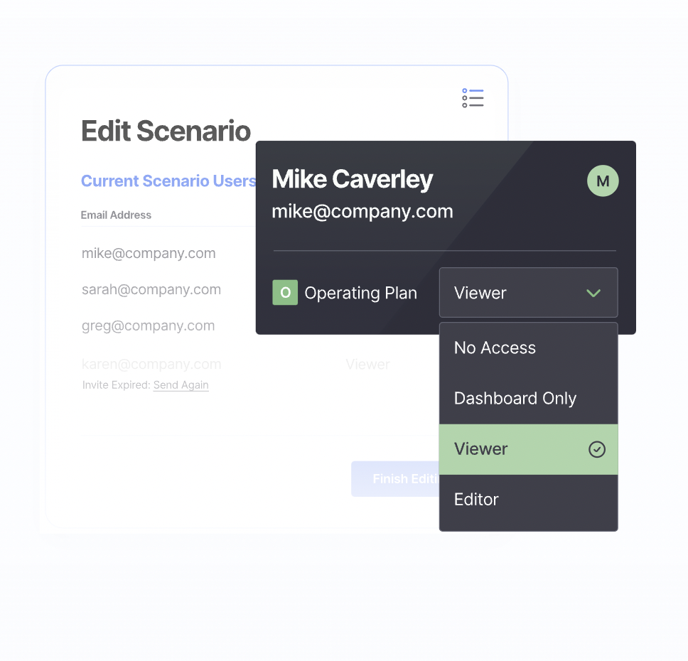 Collaborate with your team, investors, and your board with no limitations to the number of users you can invite to Finmark. Our pricing is on a per-company basis so we do not charge more for additional users!