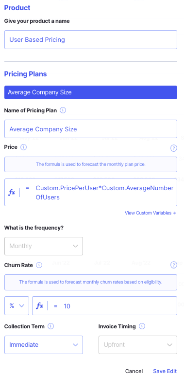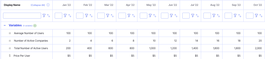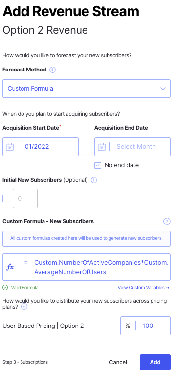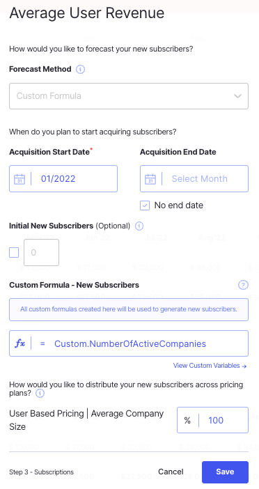 You can choose any revenue driver, in this example I am going to use a custom formula and reference my custom variable "Number of Active Companies"