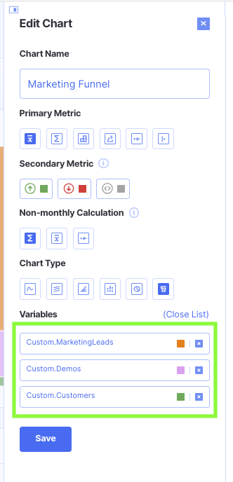 Step 2: In the Edit Custom Chart Screen, Click on the titles listed under the Variables Section to Edit the Labels.