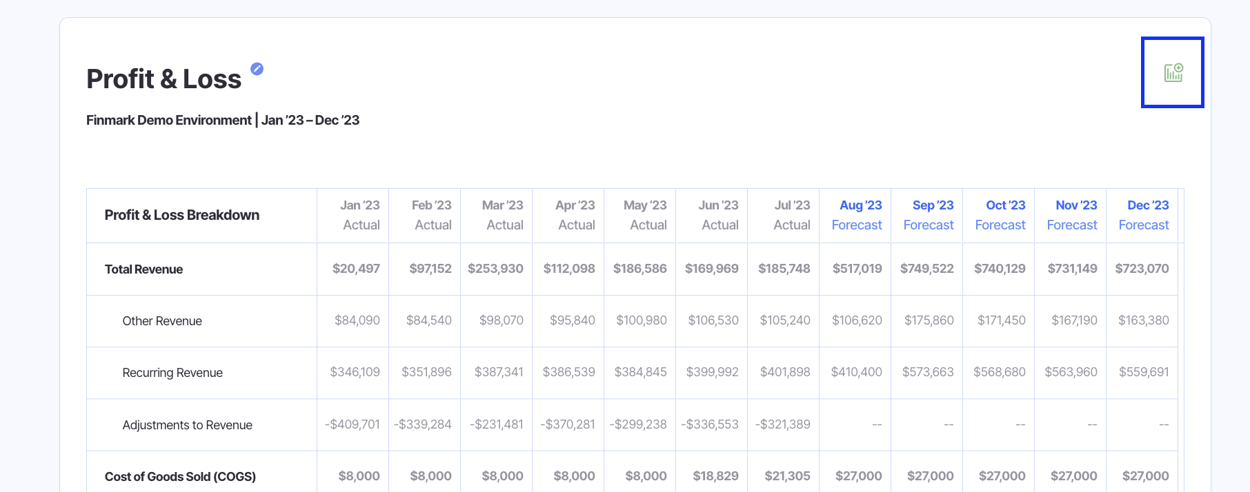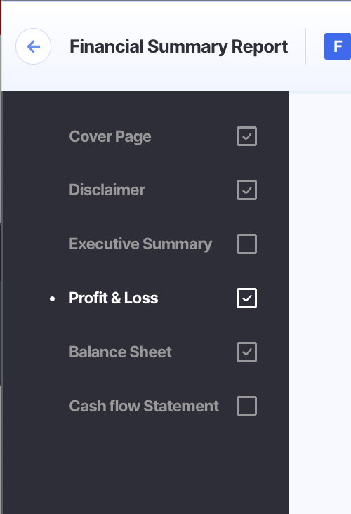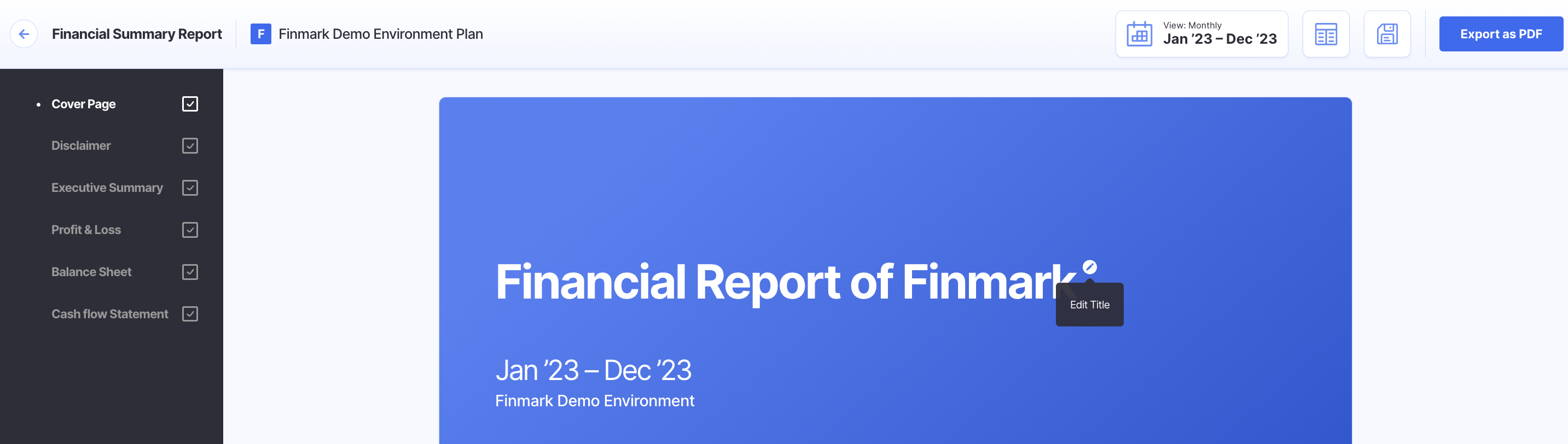 The Financial Summary Report is an automatically-generated report that can display past or forecasted financial data from your Finmark account. The Summary Report contains six sections: Cover Page, Disclaimer, Executive Summary, Profit & Loss, Balance Sheet, and Cash flow Statement.