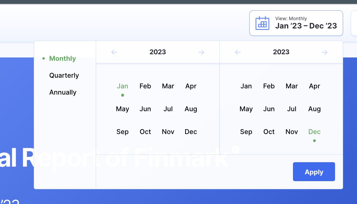 Select the ending month and year for the date range. If you select a date that includes a partial year or quarter, green lines display to indicate options that will produce a complete year or quarter range.