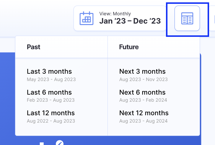 Select the last three months, last six months, last twelve months, next three months, next six months, or next twelve months. Any selections made in the Past/Future menu overwrite selections in the View menu.