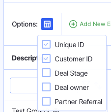 Some fields are required, while others can be toggled between displayed and hidden. To find customizable columns, click the Options icon. Columns selected to be shown display checkmarks. The checkmarks can be toggled on and off to suit your preferences.