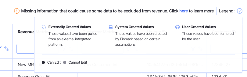 A legend indicates which columns can be edited and which are uneditable, using similar designations to the rest of the application: black is editable and gray is non-editable. In addition, it explains the three types of data that can be shown on this screen: User Created, Externally Created and System Created: