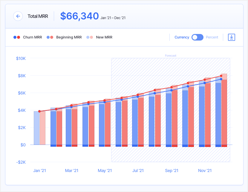 Here, we can see our MRR maxes out below $8K in our Downside scenario by the end of the year.