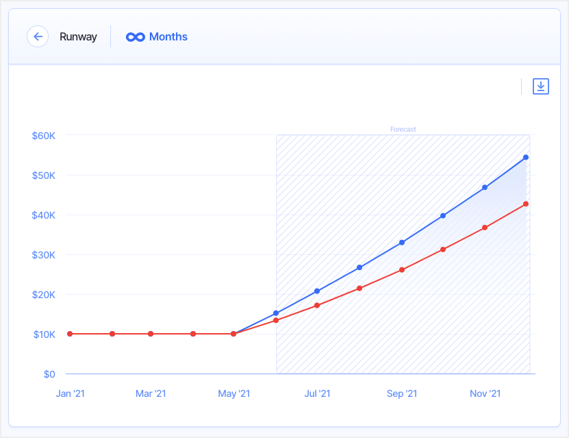 For example, when you create your downside scenario, you might project lower revenue numbers, which will impact your cash runway. But since you’ve planned it out, you’ll know what adjustments you need to make in order to sustain through down periods and course correct.