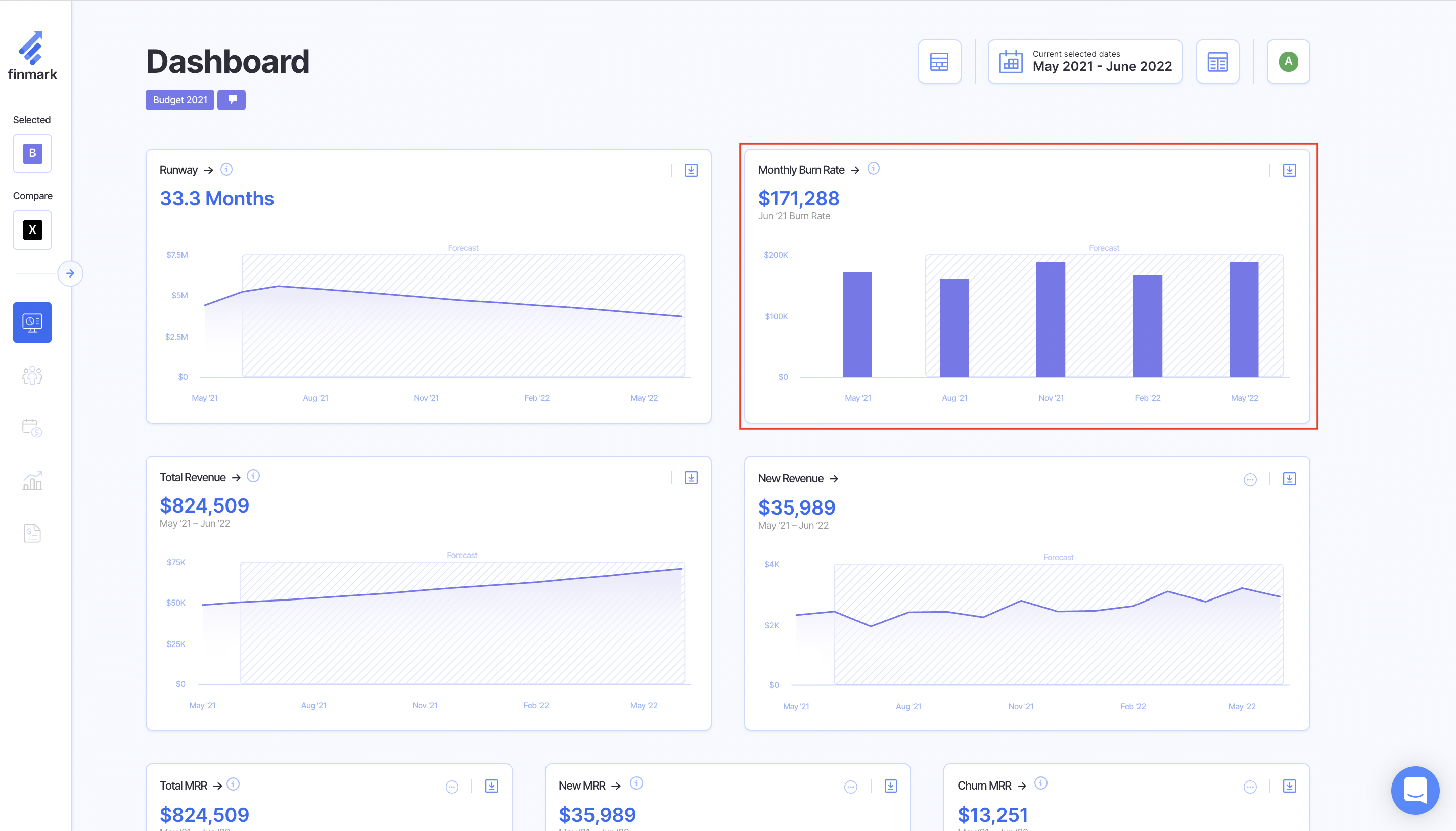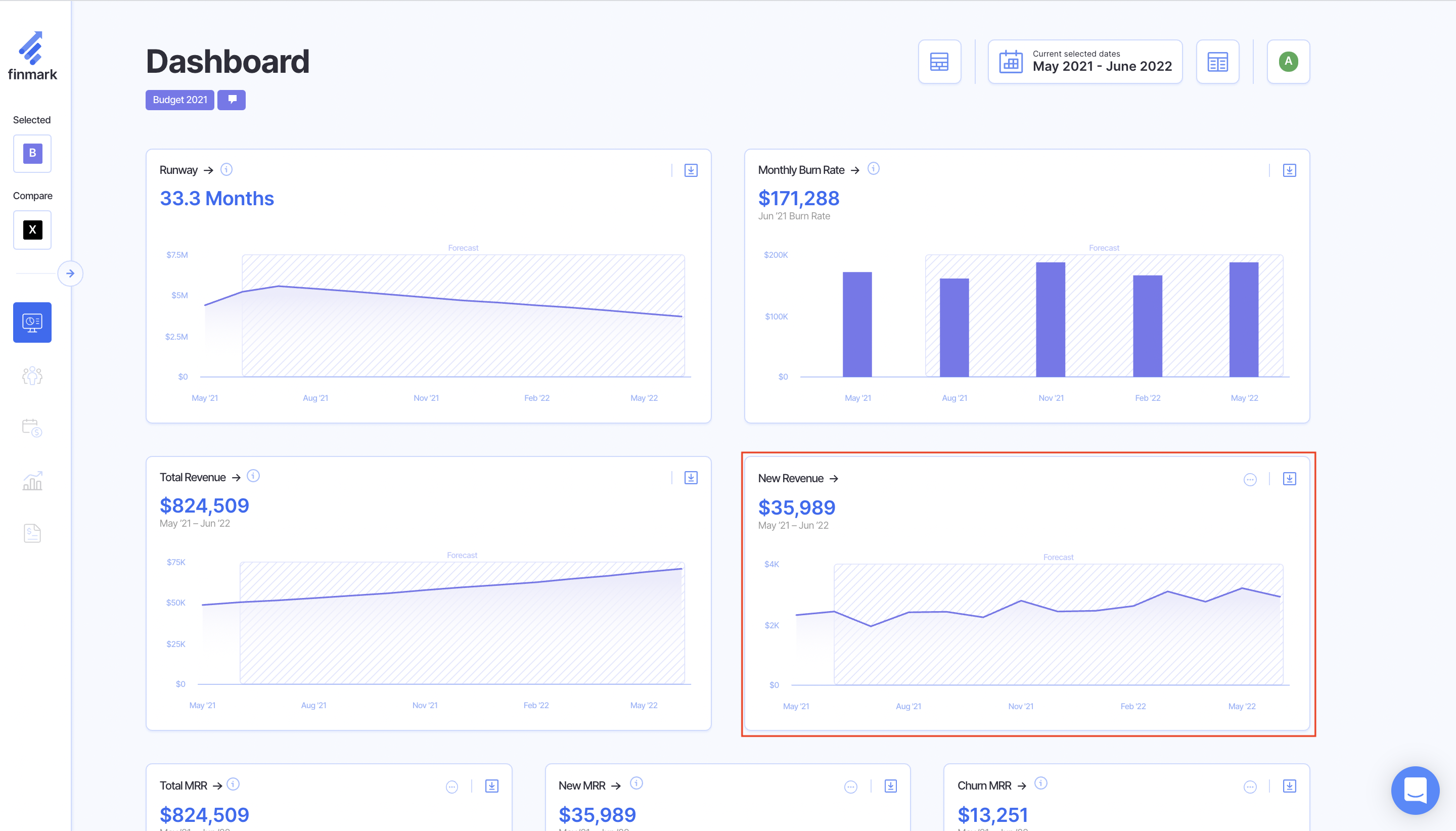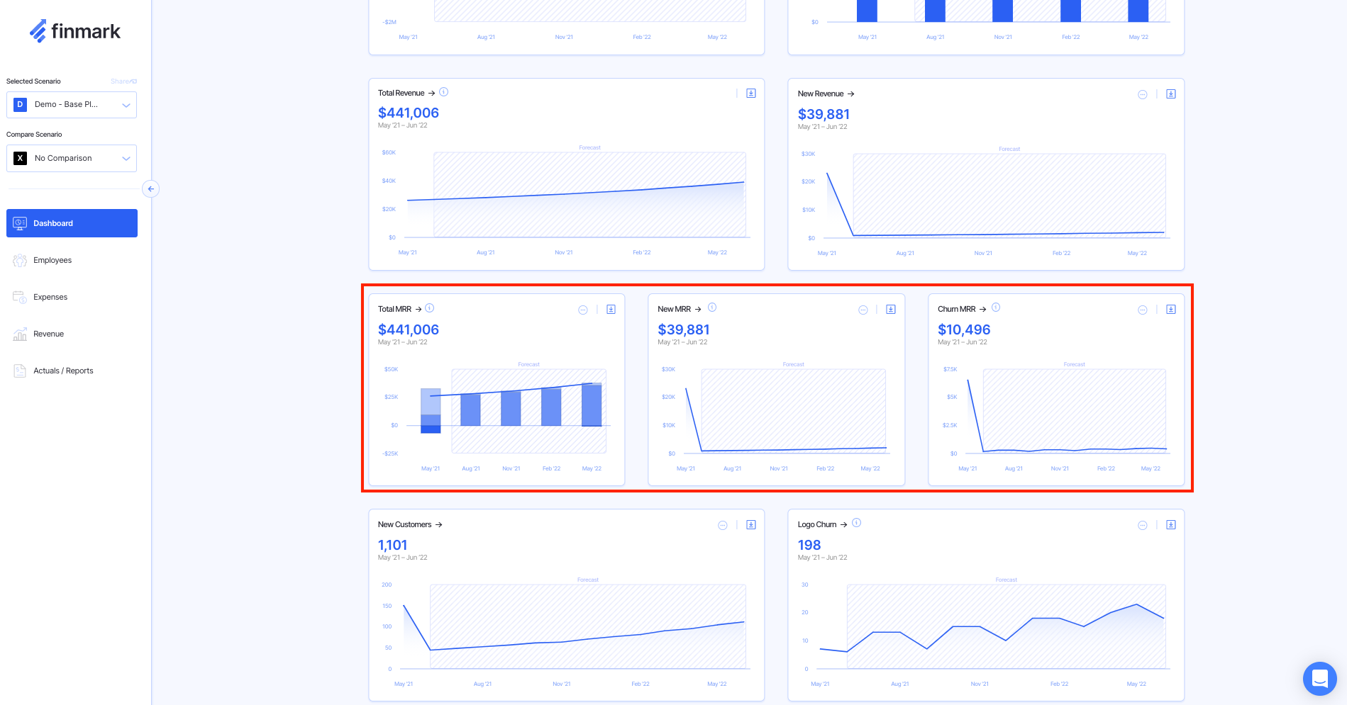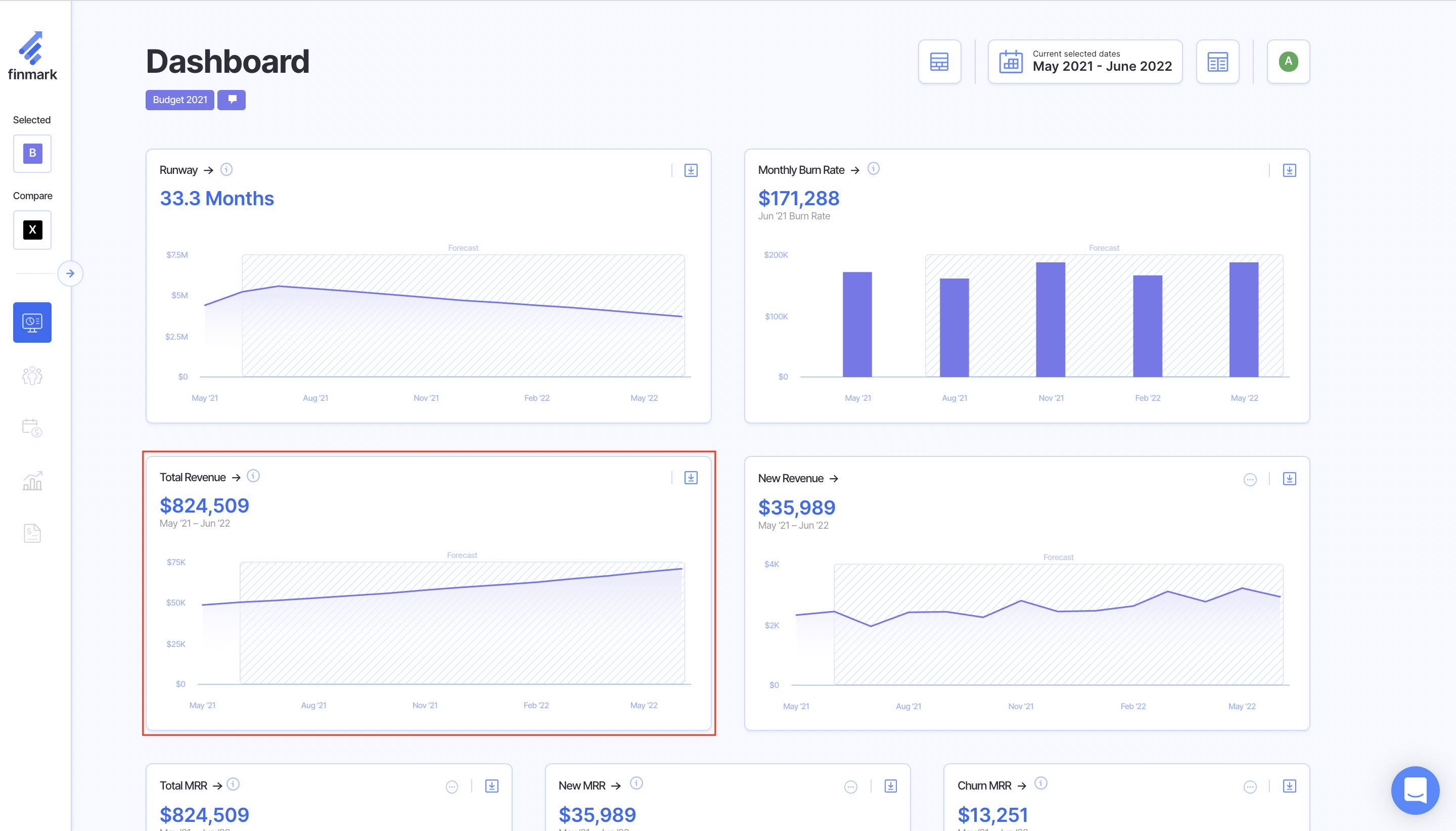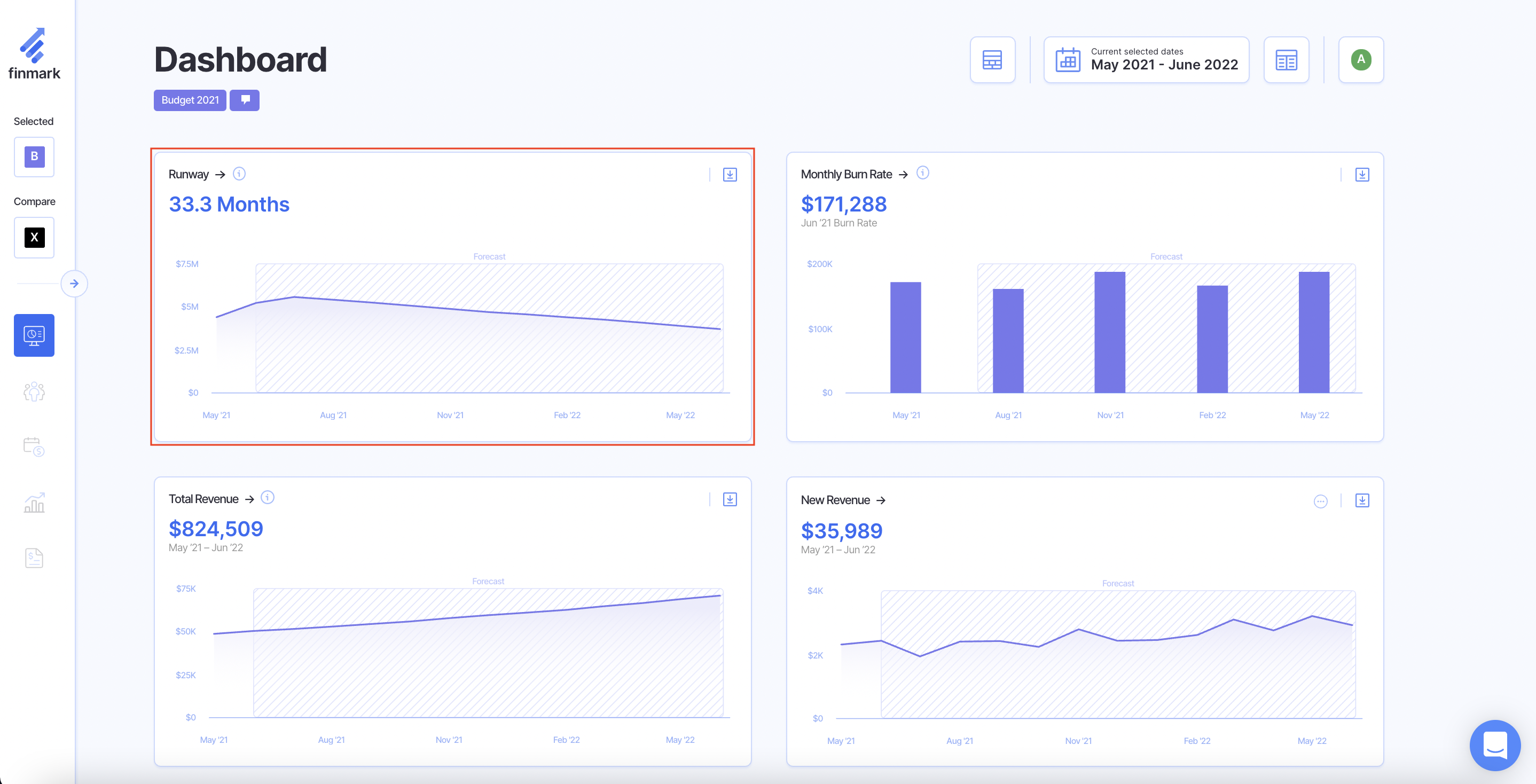The Dashboard lets you visualize your historical and forecasted key financial metrics, such as: