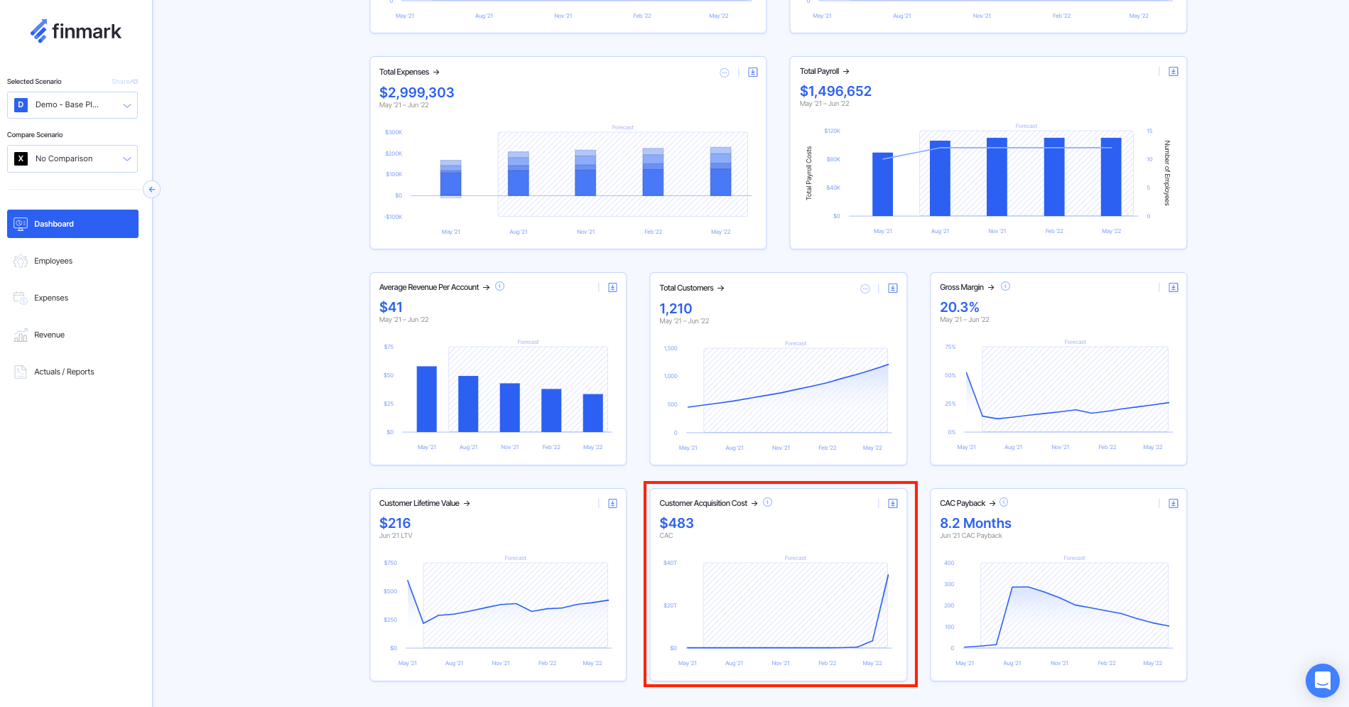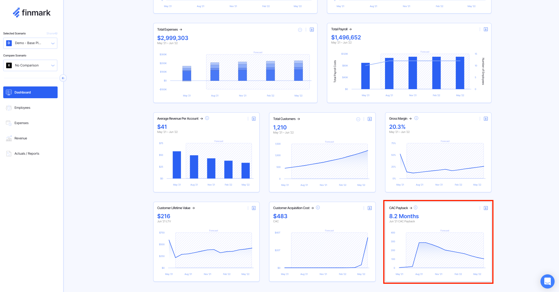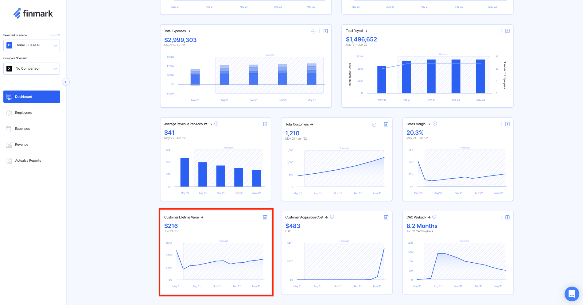 Finmark provides an intuitive dashboard with out-of-the-box calculations of your key performance indicators that you have the ability to interact with.