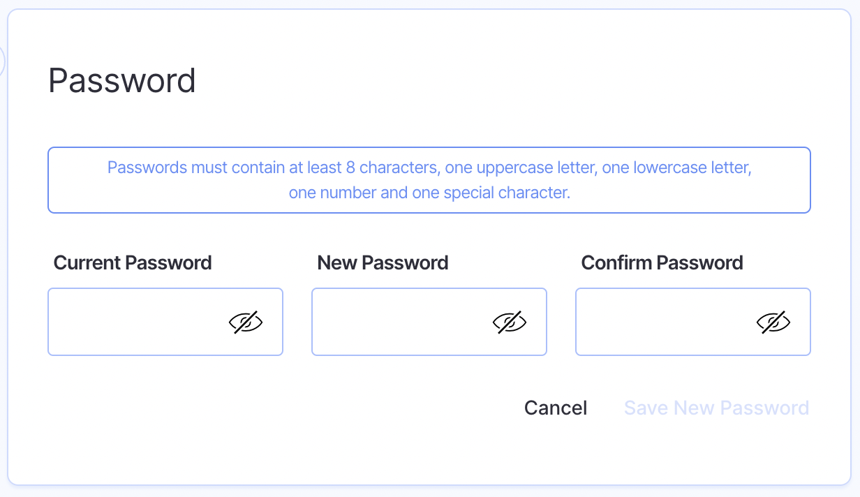From here, you'll be prompted to enter your Current Password and then you can set a New Password. Once finished, click Save New Password.