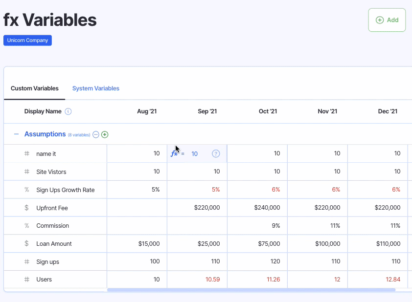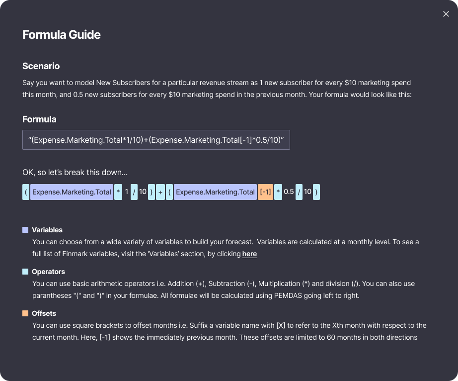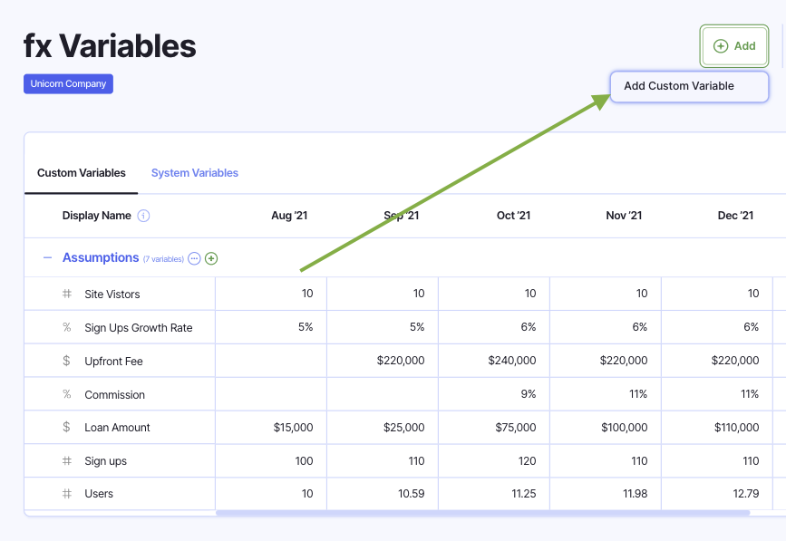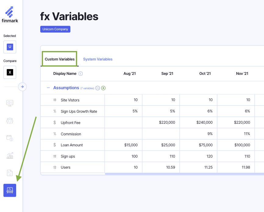 Unlike System Variablesーwhich are calculated by Finmark and are not editableーCustom Variables let you create metrics unique to your business model. Then, leverage these custom variables to tailor formulas and modeling for your revenue and expenses.