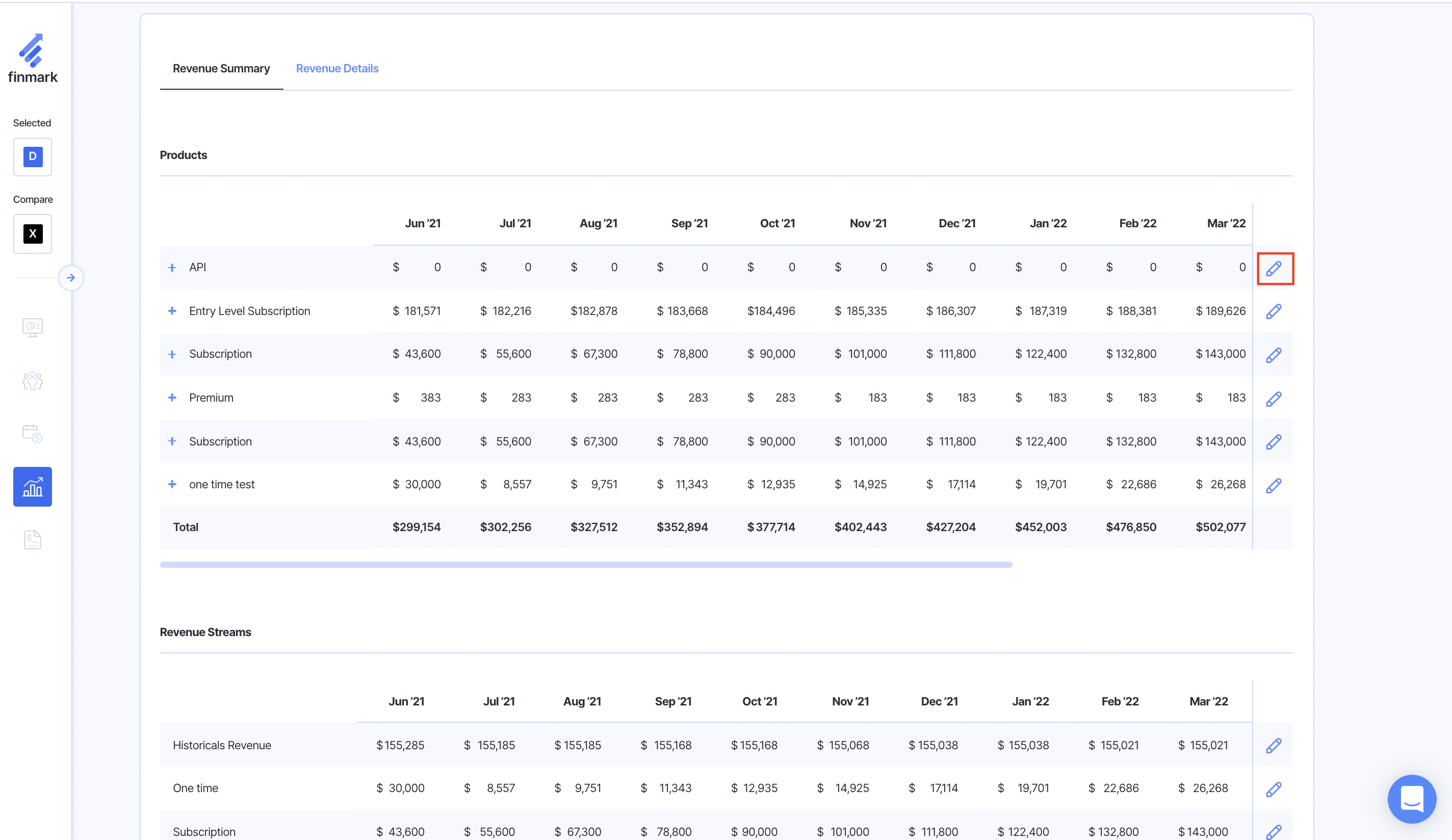 To adjust the price of the product, start on the revenue section and scroll down to the Products section of your revenue summary.