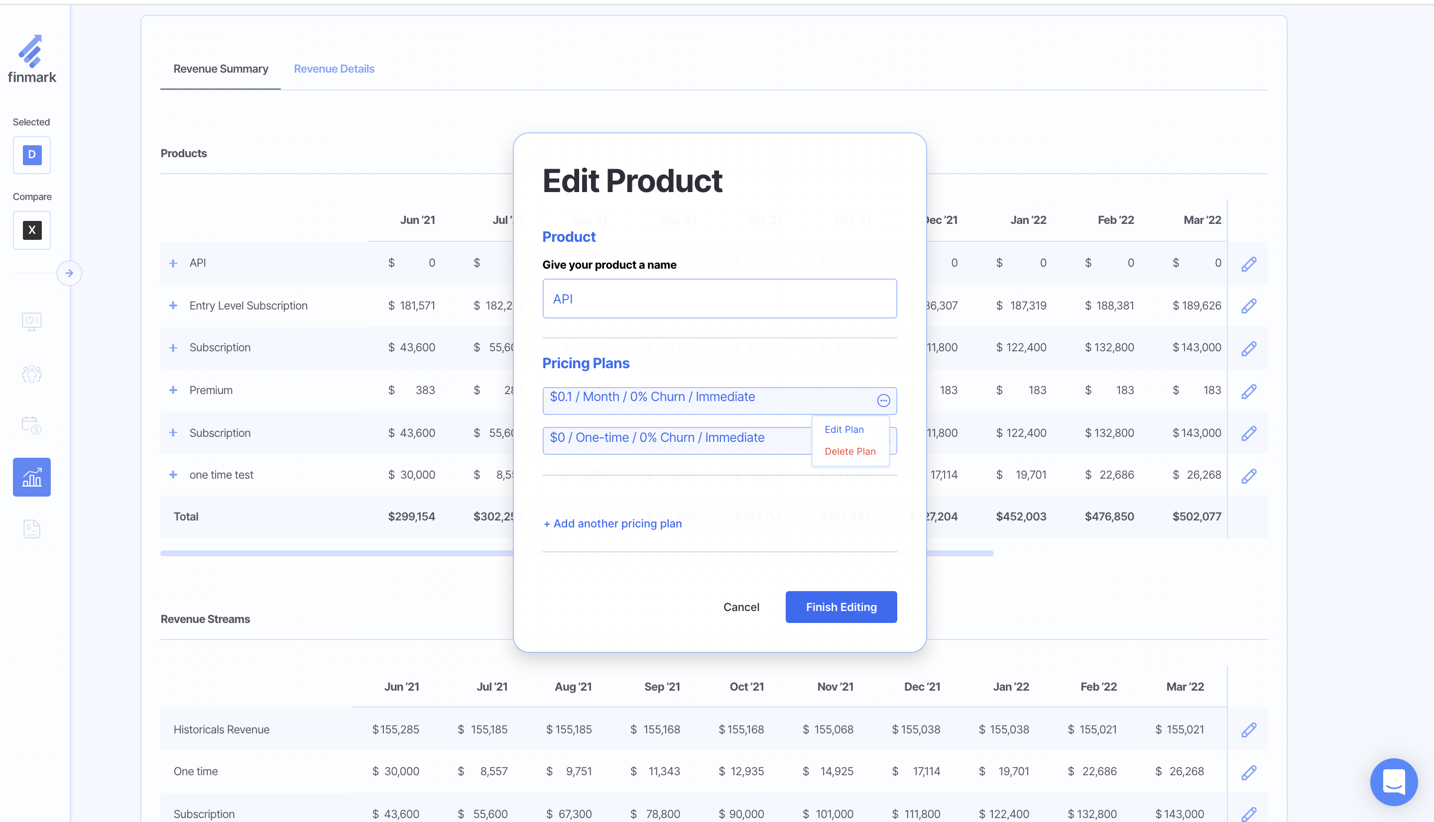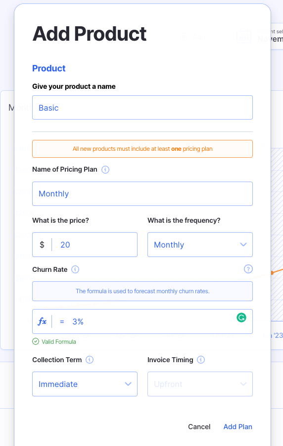 In Finmark, you can add Products and Pricing to forecast Subscriptions or One-Time Purchases. If you have a subscription or a one-time purchase make sure to add your products and pricing plans prior to adding a revenue stream.