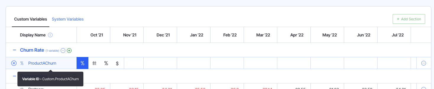 For this example, we've named the custom variable "Product A Churn" and set the variable to the % Function.