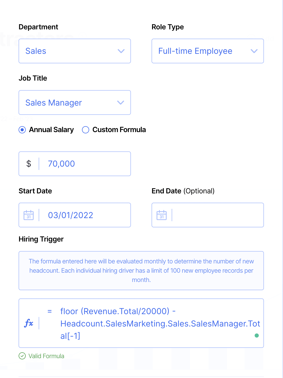 Let’s say you want to hire a Customer Success Manager (CSM) for every 200 customers on a product called “Monthly Plan” starting March 2022 (you can create products on the Revenue screen). The formula is as follows (to be entered starting March 2022):