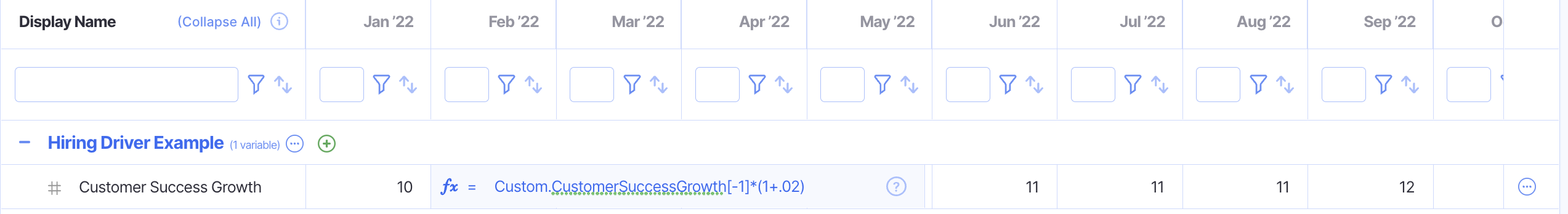 Let’s say you want to hire a Customer Success Manager (CSM) for every 5 Customer Service Reps (CSRs) starting March 2022. The formula is as follows (to be entered starting March 2022):