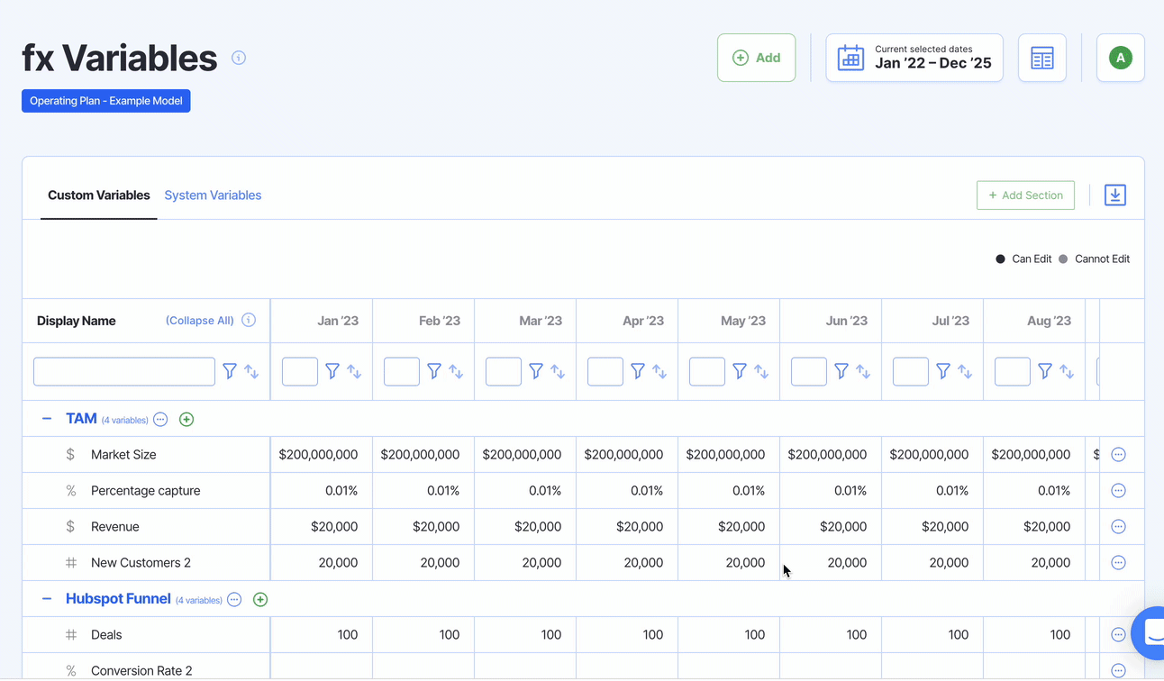Formulas: Leverage your system variables and custom variables to create formulas to forecast your revenue and expenses.