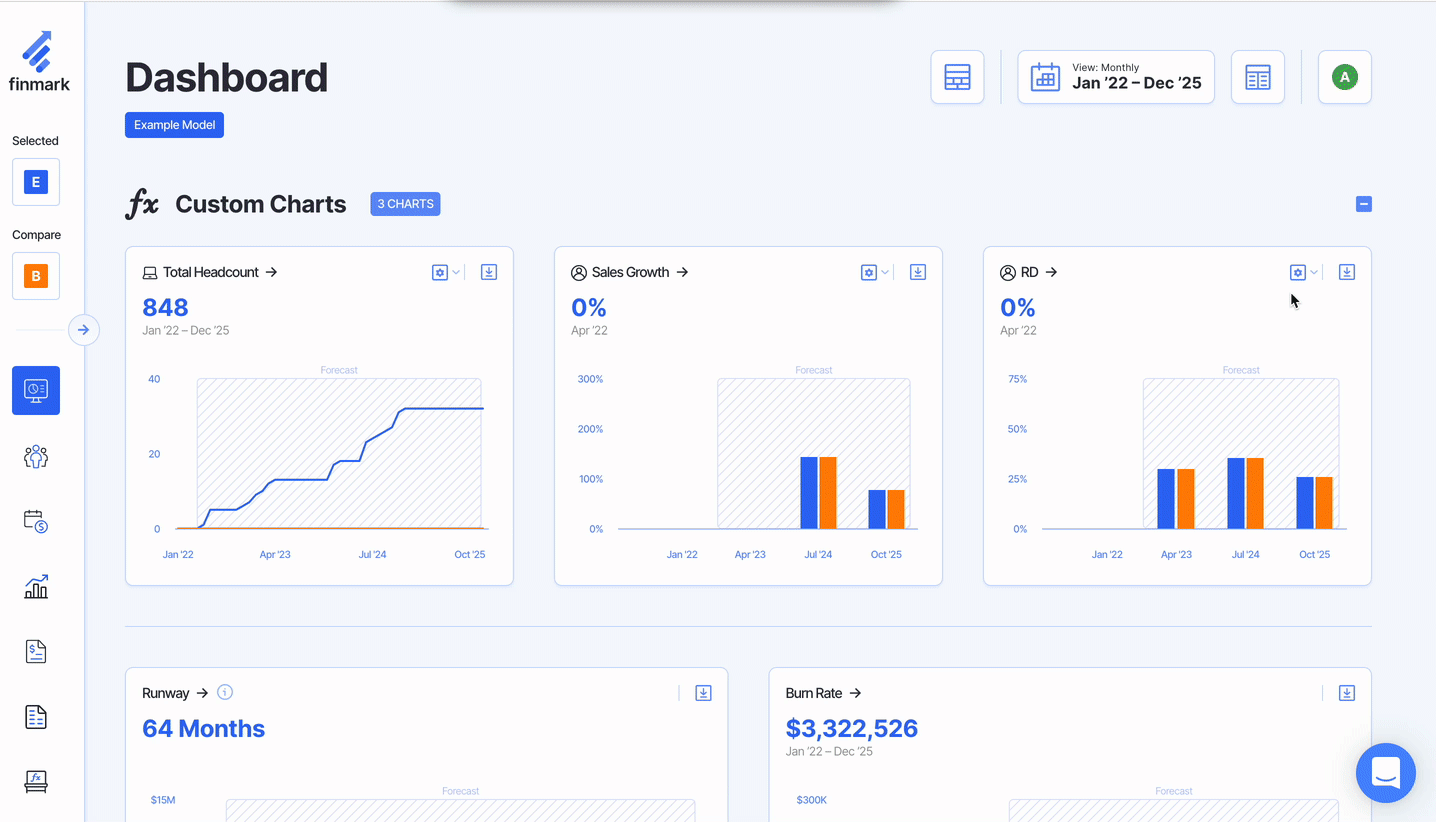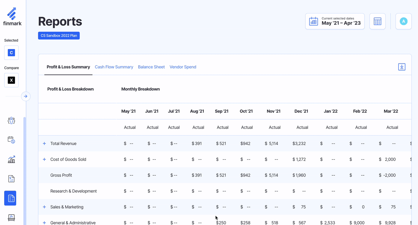 Finmark automatically generates your Profit & Loss Summary and Cash Flow Summary. With an accounting integration, Finmark will populate your Balance Sheet and Vendor Spending Report.