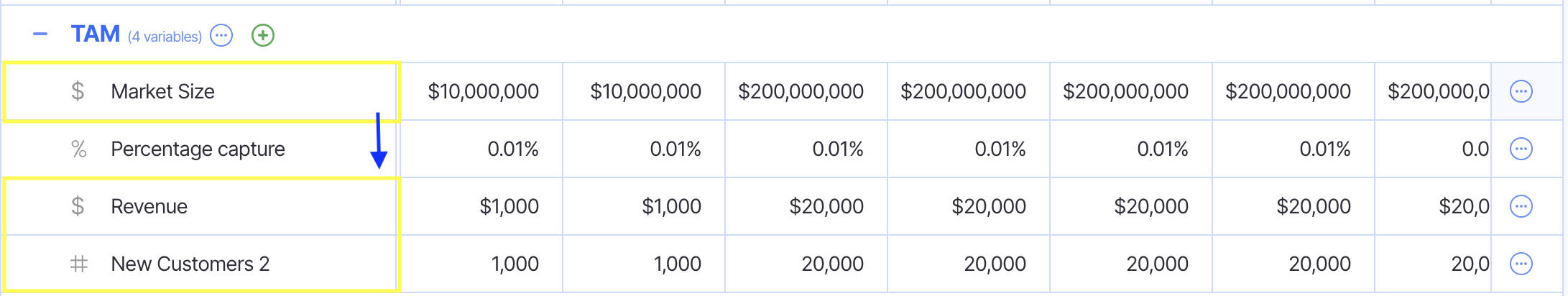 This means that the variable Market Size is being used in New Customers 2 and Revenue.