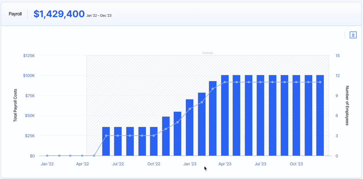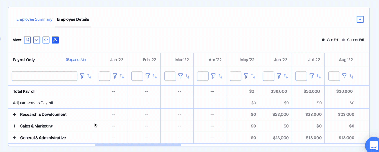 View a monthly breakdown of employees/contractors payroll and benefits. You can use this section to make adjustments for historical actuals and to edit future employee details.