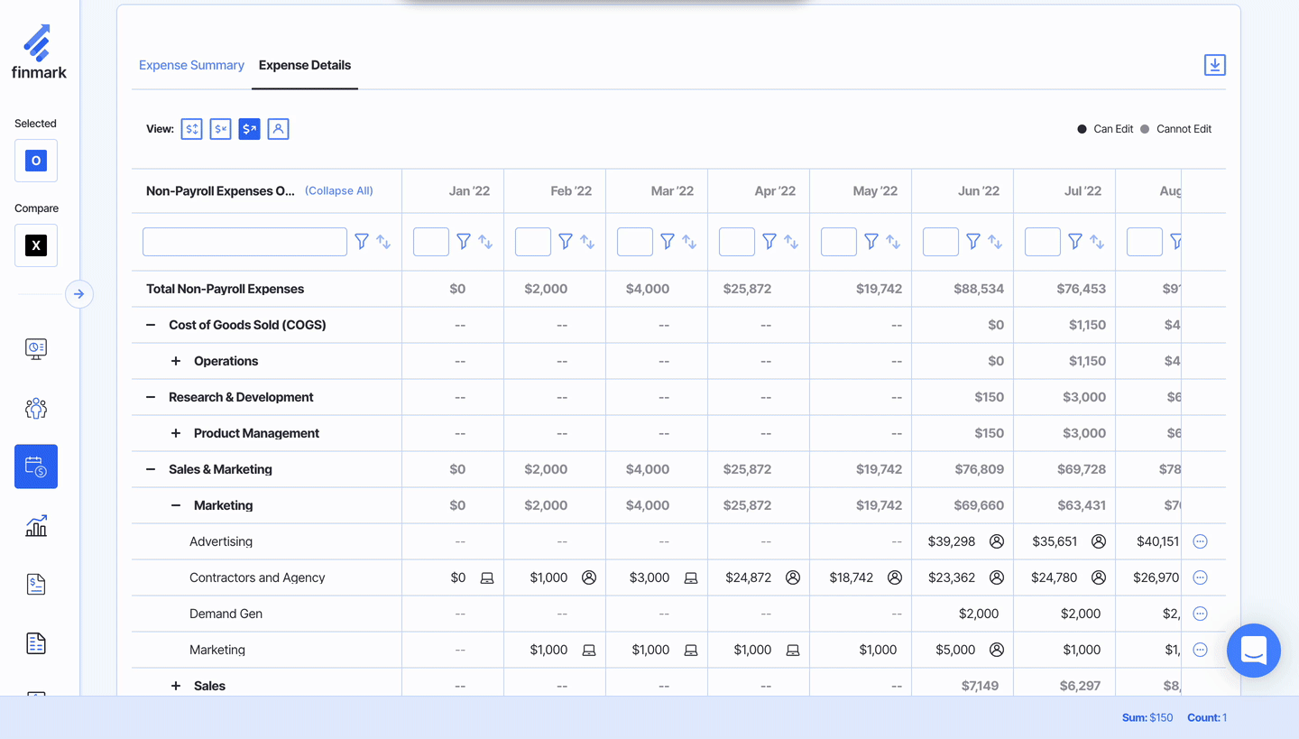 In the Expense Details section, you can view a monthly breakdown of your historical and future forecasted expenses. In this section, you can edit or adjust any historical or future expense budgets.