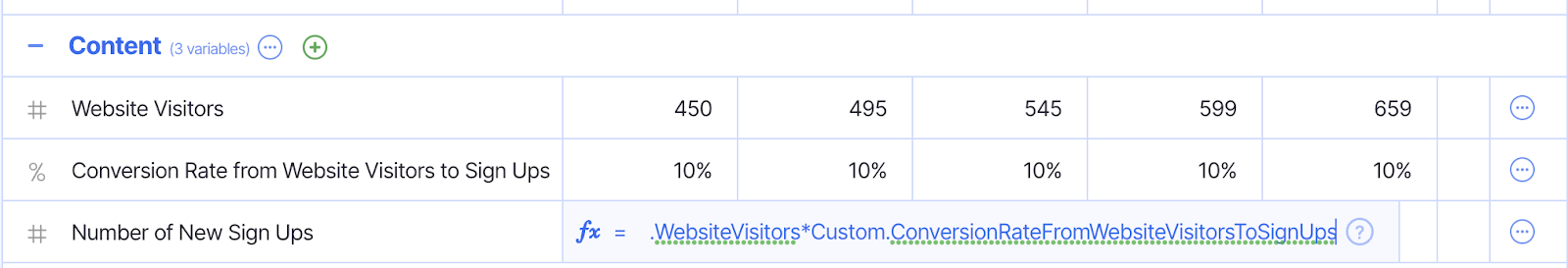 Fx = Custom.WebsiteVisitors*Custom.ConversionRateFromWebsiteVisitorsToSignUps