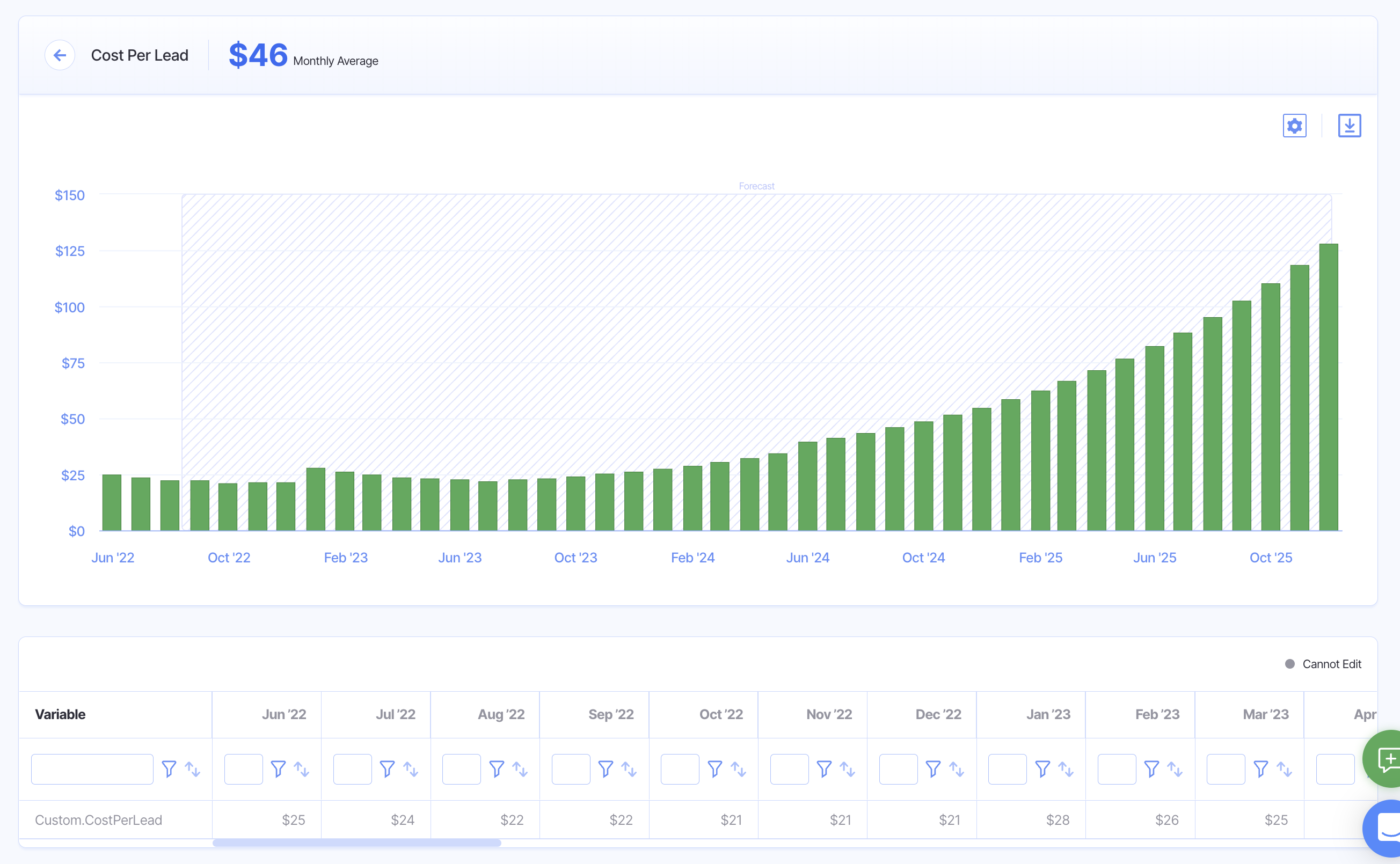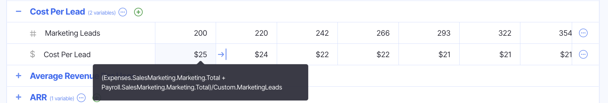 fx: (Expenses.SalesMarketing.Marketing.Total + Payroll.SalesMarketing.Marketing.Total)/Custom.MarketingLeads