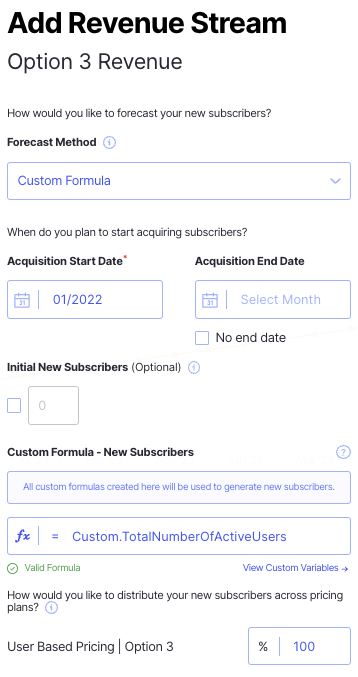 When adding your revenue stream, you will use the Custom Formula option, as shown below, using the following formula: