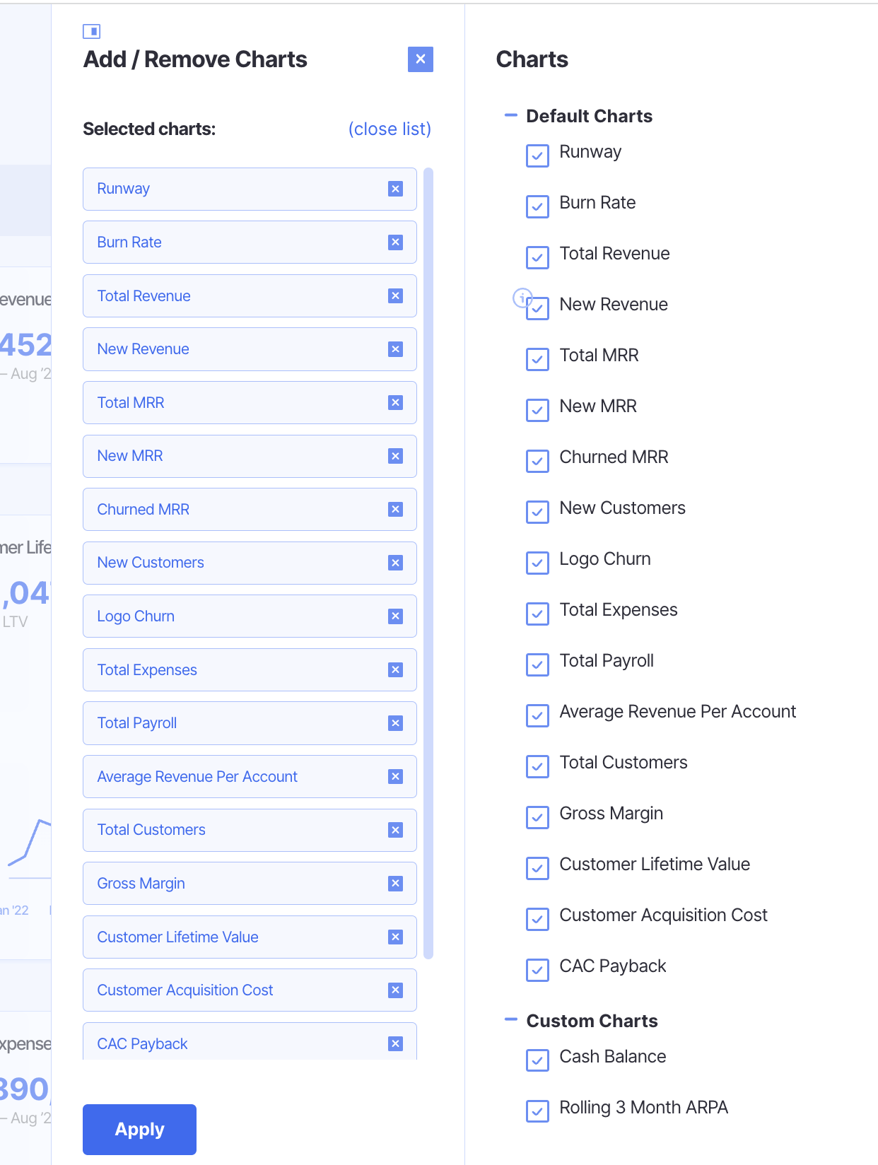 Step 3: From the Add / Remove Charts List "Uncheck" the boxes next to the charts you would like to remove and then click Apply.