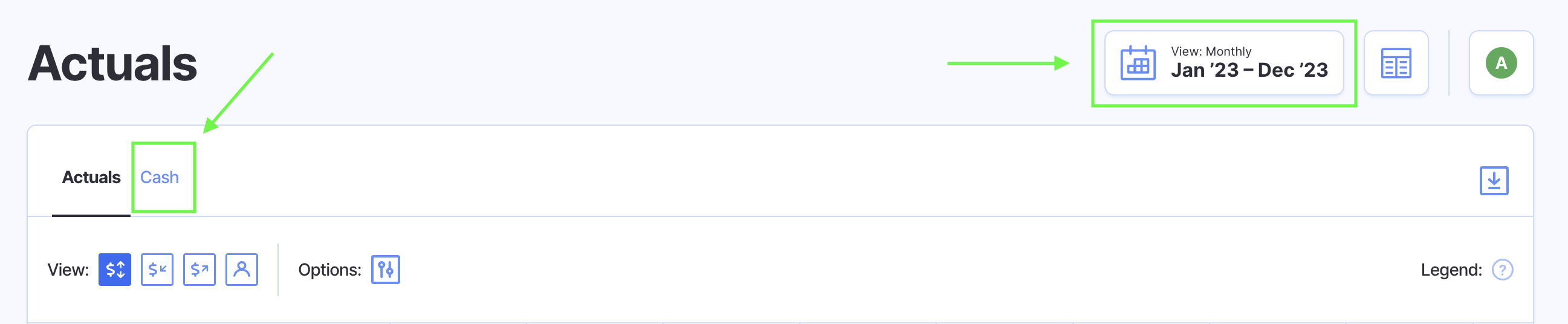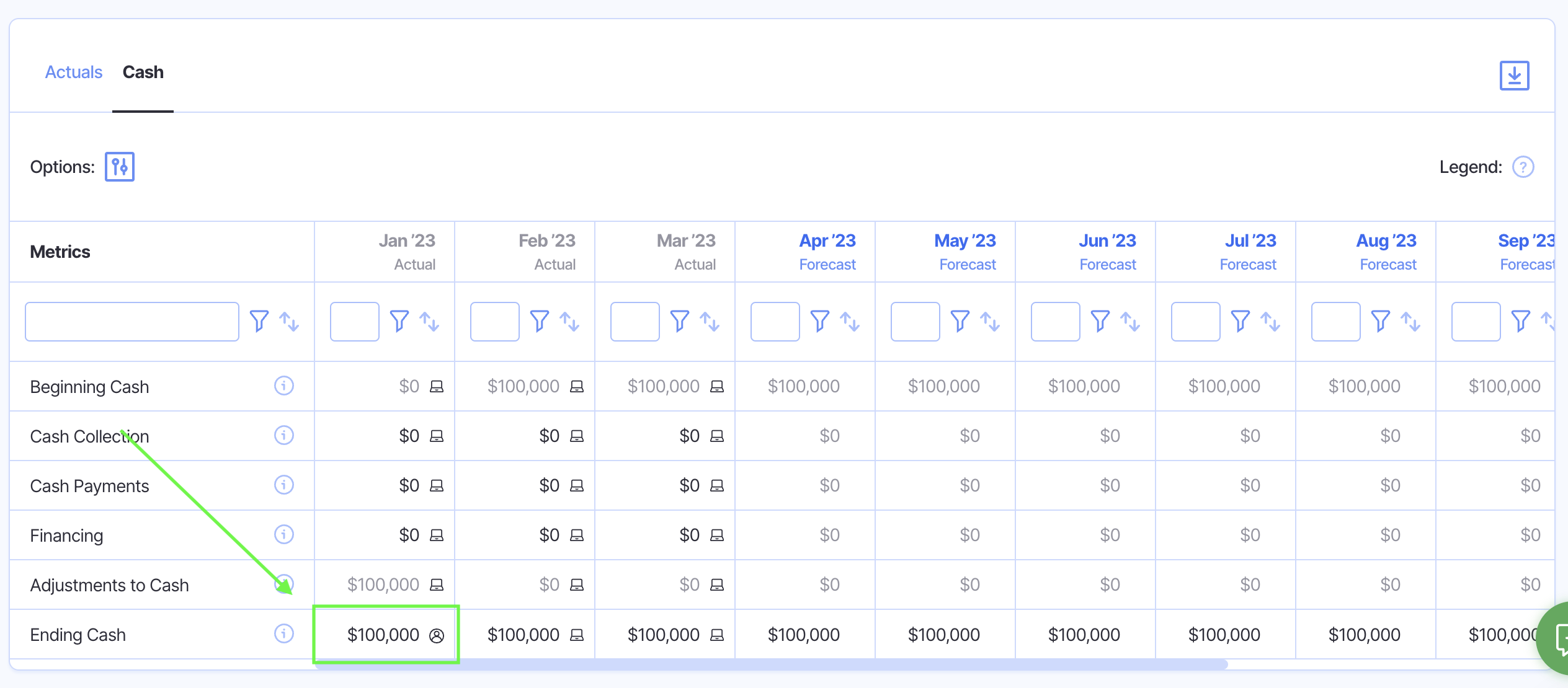 Step 2: Select the "Cash" tab in the Actuals section, then set the date picker to the month prior to the beginning cash balance adjustment.