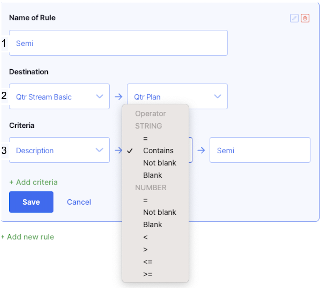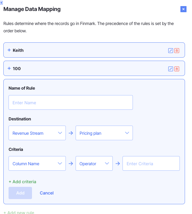 If you want to setup multiple criteria (i.e., multiple conditions that all need to be true in order to map the entry to the specified revenue stream and pricing plan), click the Add criteria link and fill in the new criteria.