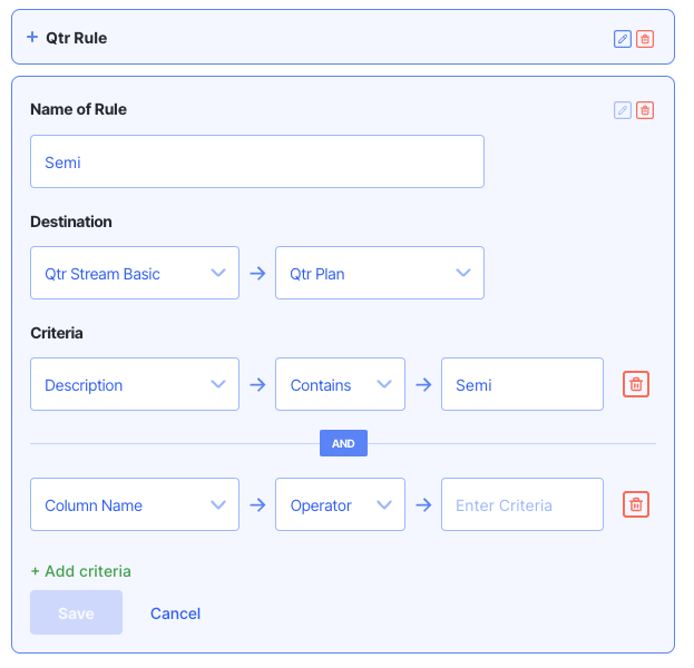 Note: There is a maximum of three criteria that can be added for any single rule. As long as there are at least two criteria, individual criterion can be removed by clicking on the red trash icon to the right of the criteria.