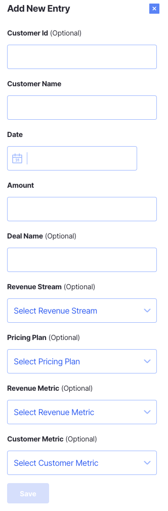If you would like to add a deal or transaction within the application in addition to the data that exists in the external revenue platform, click the Add New Entry linkand enter the required and optional, if desired, information.